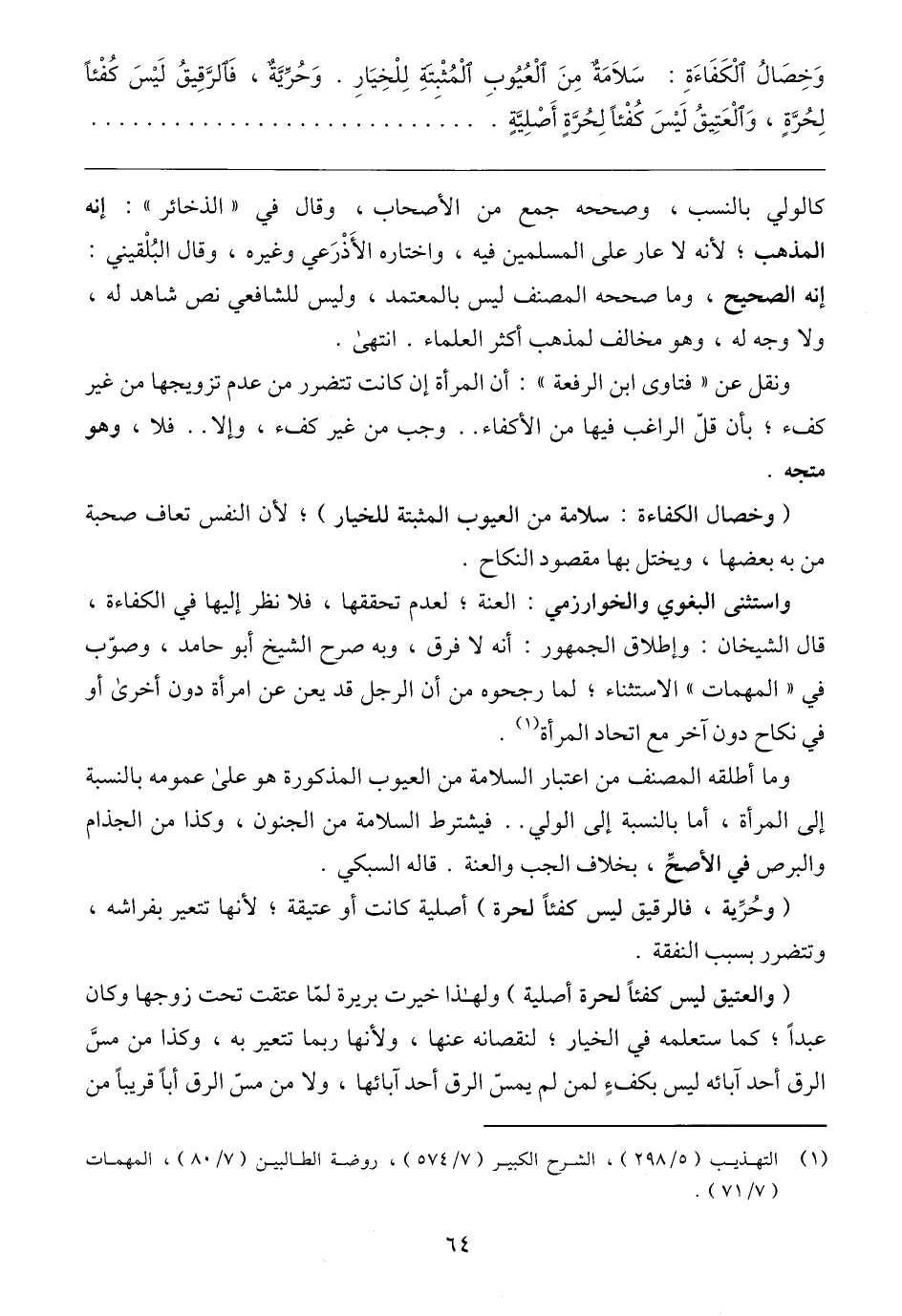 (والعتيق ليس كفئًا لحرة أصلية) ولهذا خيرت بريرة لمّا عتقت تحت زوجها وكان عبدًا، كما ستعلمه في الخيار، لنقصانه عنها، ولأنها ربما تتعير به، وكذا من مسَّ الرق أحد آبائه ليس بكفءٍ لمن لم يمسّ الرق أحد آبائها، ولا من مسّ الرق أبًا قريبًا من