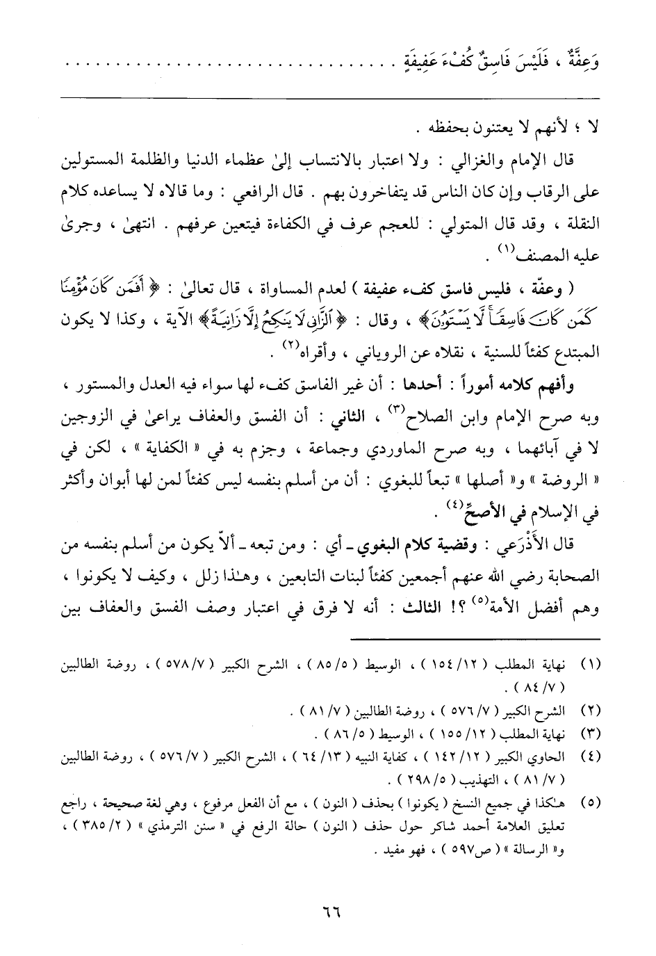 قال الأَذْرَعي: وقضية كلام البغوي -أي: ومن تبعه- ألّا يكون من أسلم بنفسه من الصحابة رضي الله عنهم أجمعين كفئًا لبنات التابعين، وهذا زلل، وكيف لا يكونوا، وهم أفضل الأمة (٥)؟ ! الثالث: أنه لا فرق في اعتبار وصف الفسق والعفاف بين