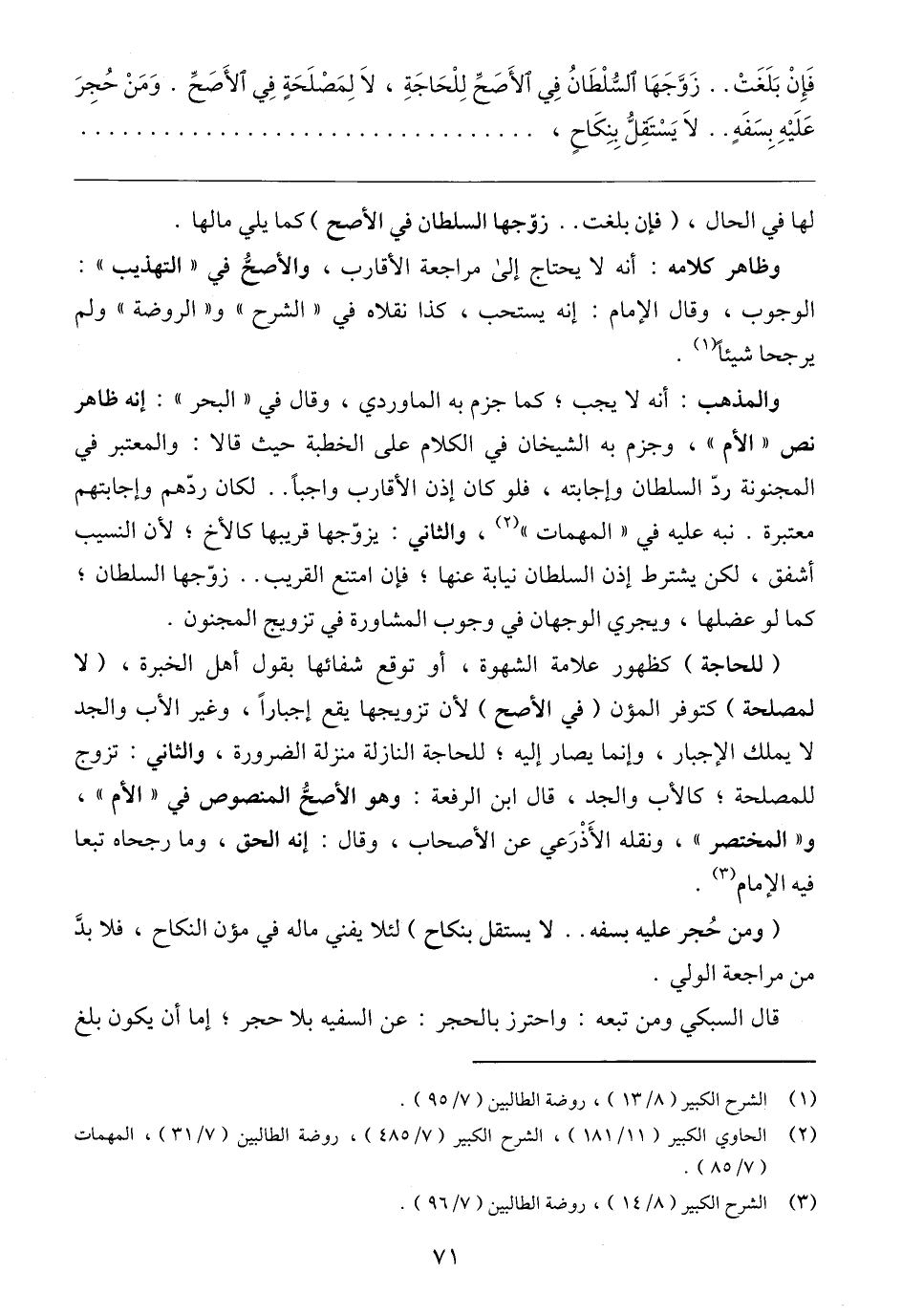 والمذهب: أنه لا يجب؛ كما جزم به الماوردي، وقال في "البحر": إنه ظاهر نص "الأم"، وجزم به الشيخان في الكلام على الخطبة حيث قالا: والمعتبر في المجنونة ردّ السلطان وإجابته، فلو كان إذن الأقارب واجبًا .. لكان ردّهم وإجابتهم معتبرة. نبه عليه في "المهمات" (٢)، والثاني: يزوّجها قريبها كالأخ؛ لأن النسيب أشفق، لكن يشترط إذن السلطان نيابة عنها؛ فإن امتنع القريب .. زوّجها السلطان؛ كما لو عضلها، ويجري الوجهان في وجوب المشاورة في تزويج المجنون.