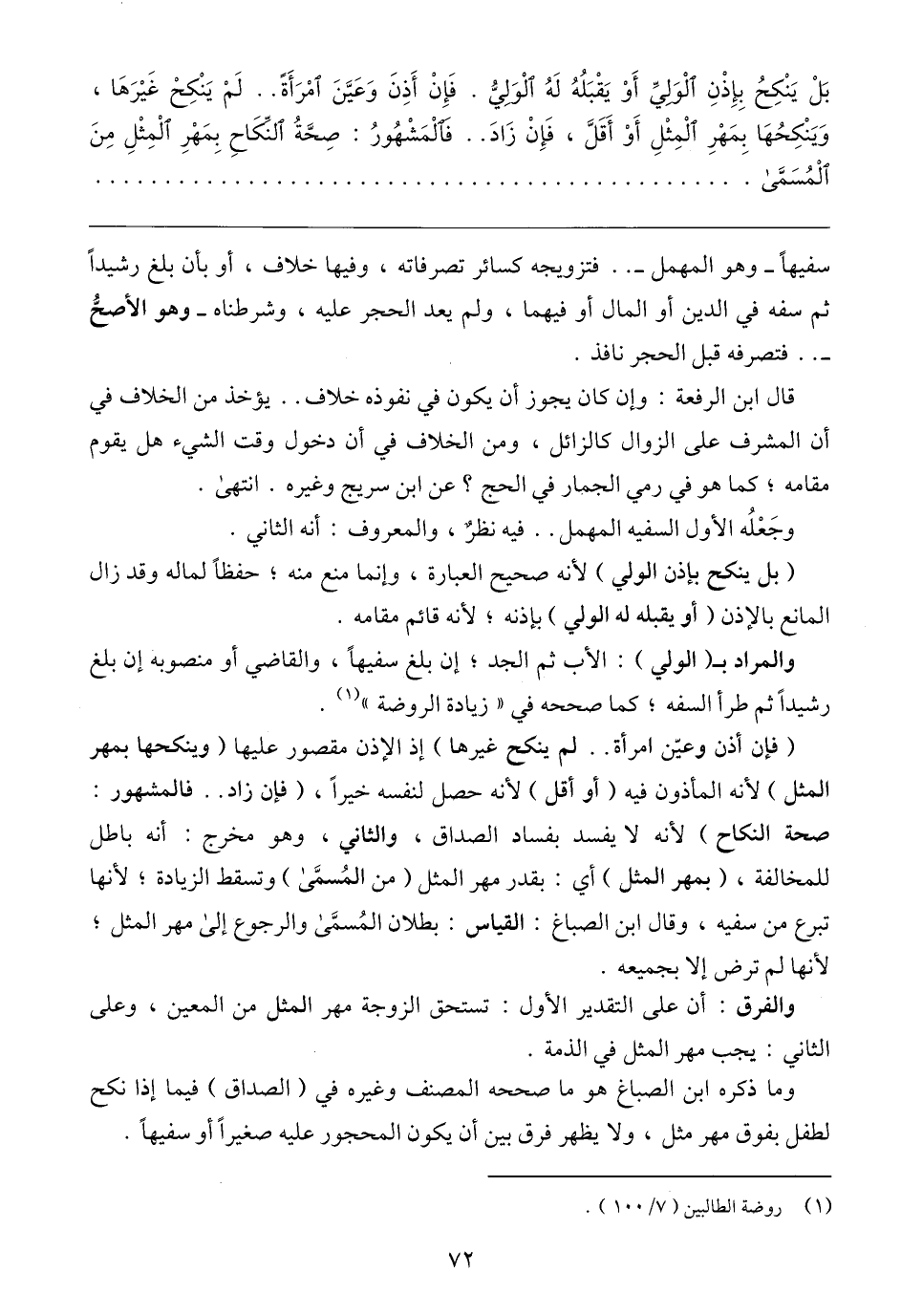 سفيهًا -وهو المهمل- .. فتزويجه كسائر تصرفاته، وفيها خلاف، أو بأن بلغ رشيدًا ثم سفه في الدين أو المال أو فيهما، ولم يعد الحجر عليه، وشرطناه -وهو الأصحُّ- .. فتصرفه قبل الحجر نافذ.