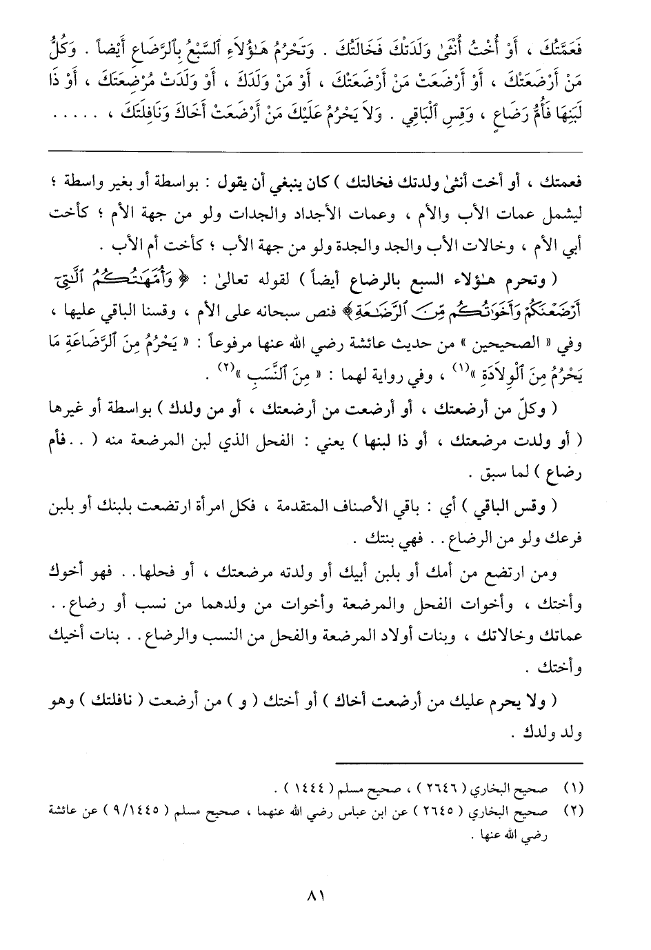 ومن ارتضع من أمك أو بلبن أبيك أو ولدته مرضعتك، أو فحلها .. فهو أخوك وأختك، وأخوات الفحل والمرضعة وأخوات من ولدهما من نسب أو رضاع .. عماتك وخالاتك، وبنات أولاد المرضعة والفحل من النسب والرضاع .. بنات أخيك وأختك.