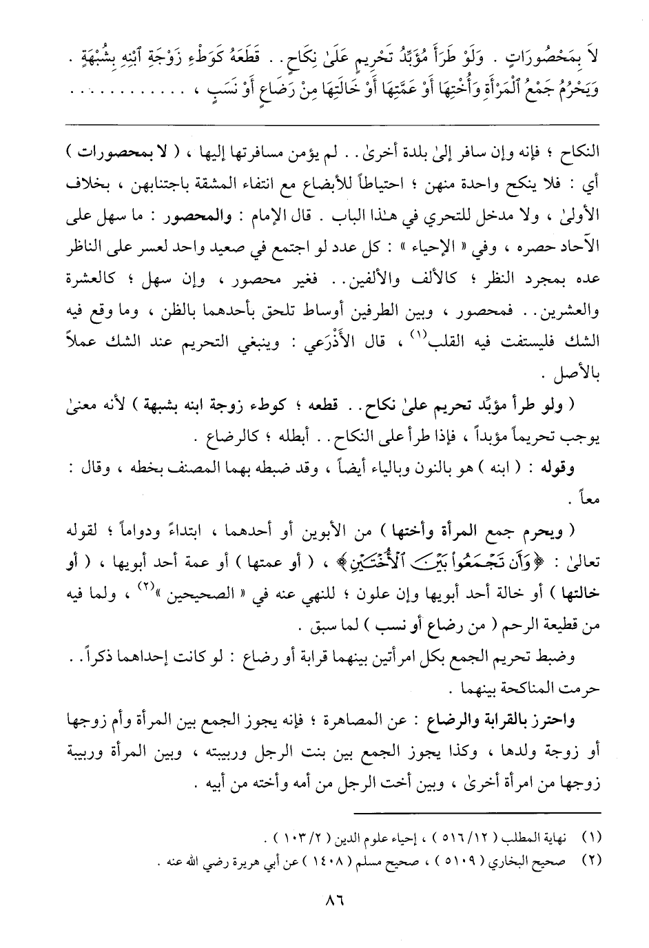 (ويحرم جمع المرأة وأختها) من الأبوين أو أحدهما، ابتداءً ودوامًا؛ لقوله تعالى: {وَأَنْ تَجْمَعُوا بَيْنَ الْأُخْتَيْنِ}، (أو عمتها) أو عمة أحد أبويها، (أو خالتها) أو خالة أحد أبويها وإن علون؛ للنهي عنه في "الصحيحين" (٢)، ولما فيه من قطيعة الرحم (من رضاع أو نسب) لما سبق.