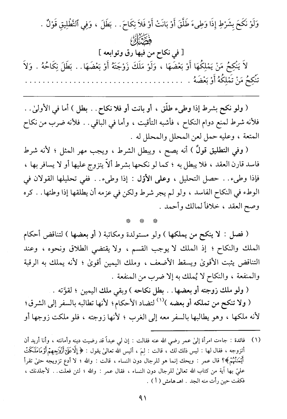 (ولا تنكح من تملكه أو بعضه) (١) لتضاد الأحكام؛ لأنها تطالبه بالسفر إلى الشرق؛ لأنه ملكها، وهو يطالبها بالسفر معه إلى الغرب؛ لأنها زوجته، فلو ملكت زوجها أو