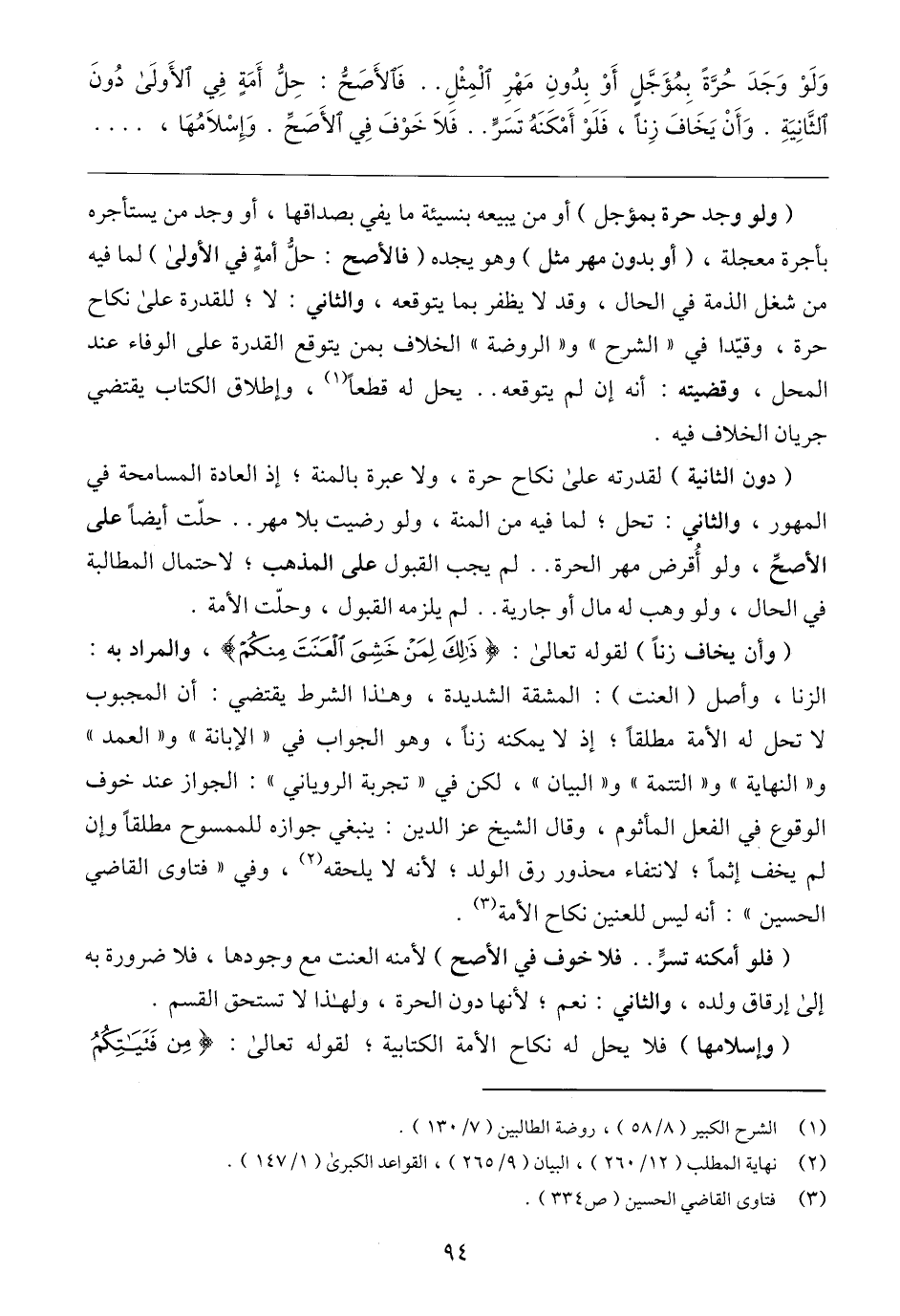 (وأن يخاف زنًا) لقوله تعالى: {ذَلِكَ لِمَنْ خَشِيَ الْعَنَتَ مِنْكُمْ} , والمراد به: الزنا، وأصل (العنت): المشقة الشديدة، وهذا الشرط يقتضي: أن المجبوب لا تحل له الأمة مطلقًا؛ إذ لا يمكنه زنًا، وهو الجواب في "الإبانة" و"العمد" و"النهاية" و"التتمة" و"البيان"، لكن في "تجربة الروياني": الجواز عند خوف الوقوع في الفعل المأثوم، وقال الشيخ عز الدين: ينبغي جوازه للممسوح مطلقًا وإن لم يخف إثمًا؛ لانتفاء محذور رق الولد؛ لأنه لا يلحقه (٢)، وفي "فتاوى القاضي الحسين": أنه ليس للعنين نكاح الأمة (٣).