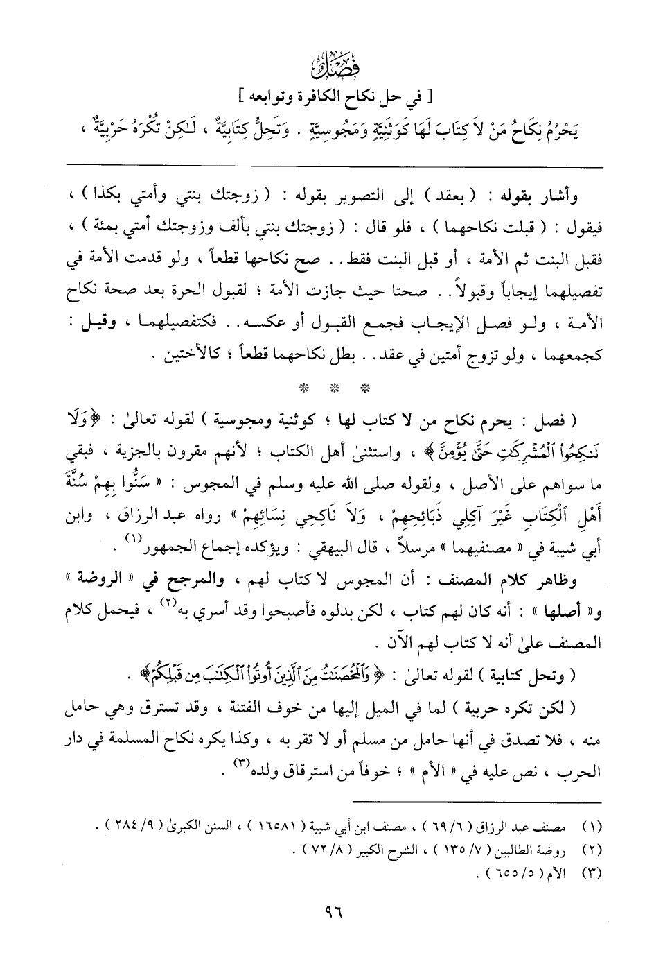 (فصل: يحرم نكاح من لا كتاب لها؛ كوثنية ومجوسية) لقوله تعالى {وَلَا تَنْكِحُوا الْمُشْرِكَاتِ حَتَّى يُؤْمِنَّ} , واستثنى أهل الكتاب؛ لأنهم مقرون بالجزية، فبقي ما سواهم على الأصل، ولقوله صلى الله عليه وسلم في المجوس: "سَنُّوا بِهِمْ سُنَّةَ أَهْلِ الْكِتَابِ غَيْرَ آكِلِي ذَبَائِحِهِمْ، وَلَا نَاكِحِي نِسَائِهِمْ" رواه عبد الرزاق، وابن أبي شيبة في "مصنفيهما" مرسلًا، قال البيهقي: ويؤكده إجماع الجمهور (١).