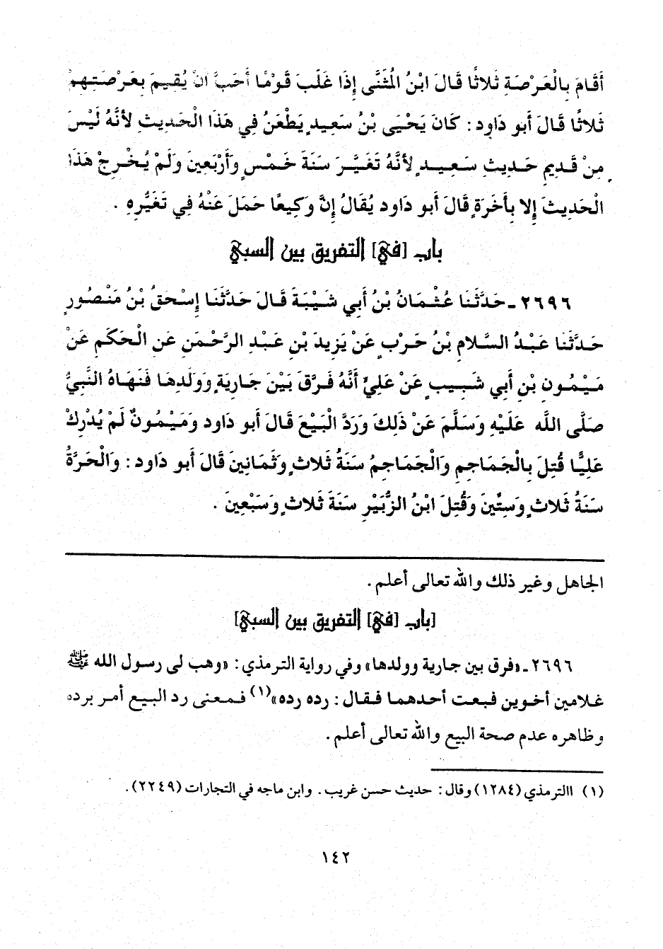 2696 - حَدَّثَنَا عُثْمَانُ بْنُ أَبِي شَيْبَةَ، قَالَ: حَدَّثَنَا إِسْحَاقُ بْنُ مَنْصُورٍ، حَدَّثَنَا عَبْدُ السَّلَامِ بْنُ حَرْبٍ، عَنْ يَزِيدَ بْنِ عَبْدِ الرَّحْمَنِ، عَنِ الْحَكَمِ، عَنْ مَيْمُونِ بْنِ أَبِي شَبِيبٍ، عَنْ عَلِيٍّ، أَنَّهُ فَرَّقَ بَيْنَ جَارِيَةٍ وَوَلَدِهَا «فَنَهَاهُ النَّبِيُّ صلّى الله عليه وسلم عَنْ ذَلِكَ وَرَدَّ الْبَيْعَ» قَالَ أَبُو دَاوُدَ: «وَمَيْمُونٌ لَمْ يُدْرِكْ عَلِيًّا قُتِلَ بِالْجَمَاجِمِ، وَالْجَمَاجِمُ سَنَةُ ثَلَاثٍ وَثَمَانِينَ» قَالَ أَبُو دَاوُدَ: «وَالْحَرَّةُ سَنَةُ ثَلَاثٍ وَسِتِّينَ، وَقُتِلَ ابْنُ الزُّبَيْرِ سَنَةَ ثَلَاثٍ وَسَبْعِينَ».