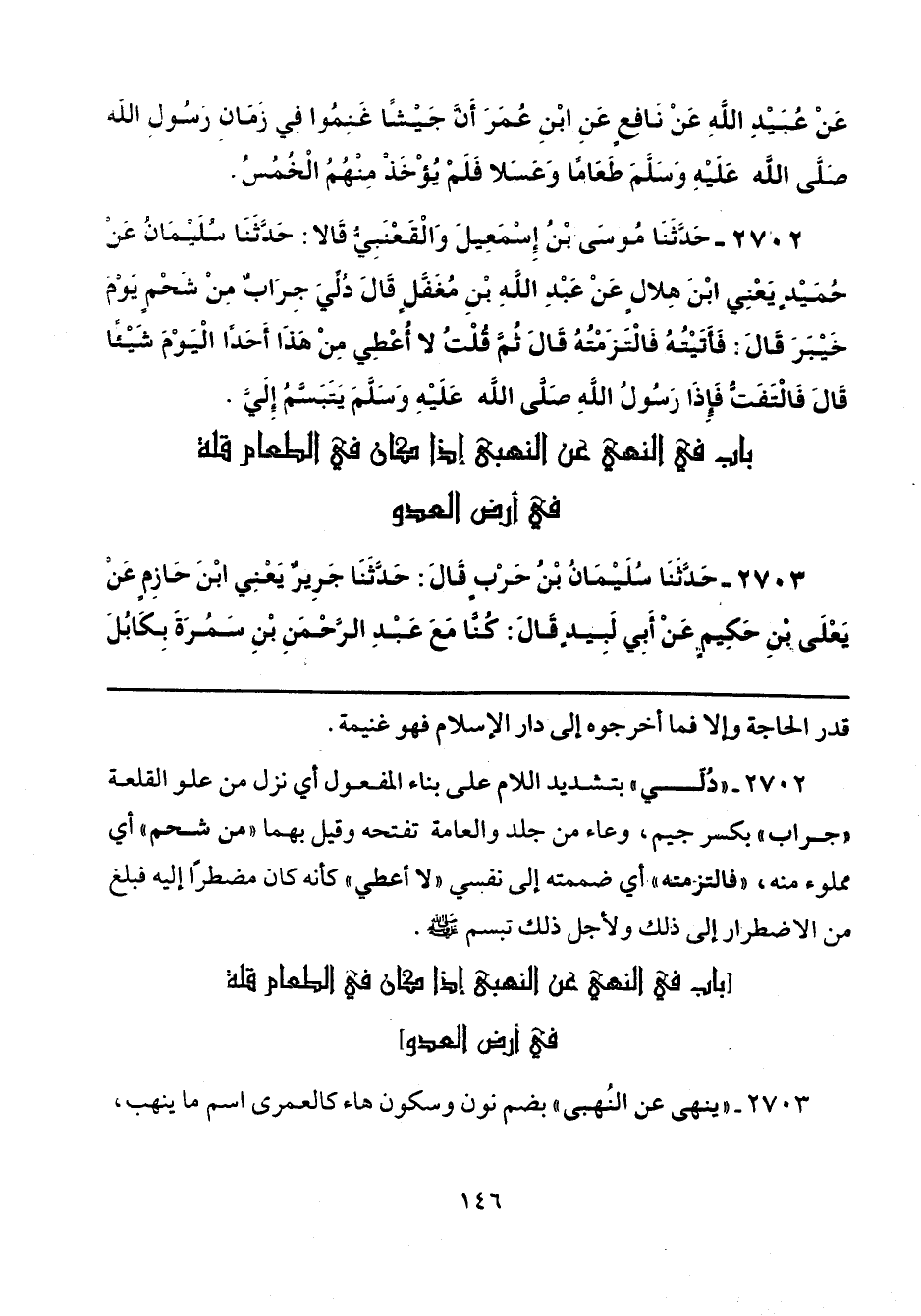 بَابٌ فِي النَّهْيِ عَنِ النُّهْبَى إِذَا كَانَ فِي الطَّعَامِ قِلَّةٌ فِي أَرْضِ الْعَدُوِّ