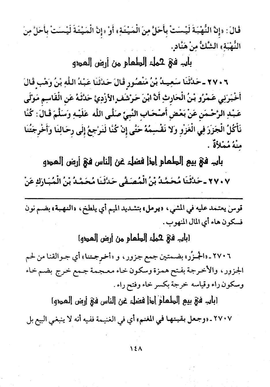 2706 - حَدَّثَنَا سَعِيدُ بْنُ مَنْصُورٍ، قَالَ: حَدَّثَنَا عَبْدُ اللَّهِ بْنُ وَهْبٍ، قَالَ: أَخْبَرَنِي عَمْرُو بْنُ الْحَارِثِ، أَنَّ ابْنَ حَرْشَفٍ الْأَزْدِيَّ حَدَّثَهُ، عَنِ الْقَاسِمِ مَوْلَى عَبْدِ الرَّحْمَنِ، عَنْ بَعْضِ أَصْحَابِ النَّبِيِّ صَلَّى اللهُ عَلَيْهِ وَسَلَّمَ قَالَ: كُنَّا «نَأْكُلُ الْجَزَرَ فِي الْغَزْوِ وَلَا نَقْسِمُهُ حَتَّى إِنْ كُنَّا لَنَرْجِعُ إِلَى رِحَالِنَا، وَأَخْرِجَتُنَا مِنْهُ مُمْلَأَةٌ».