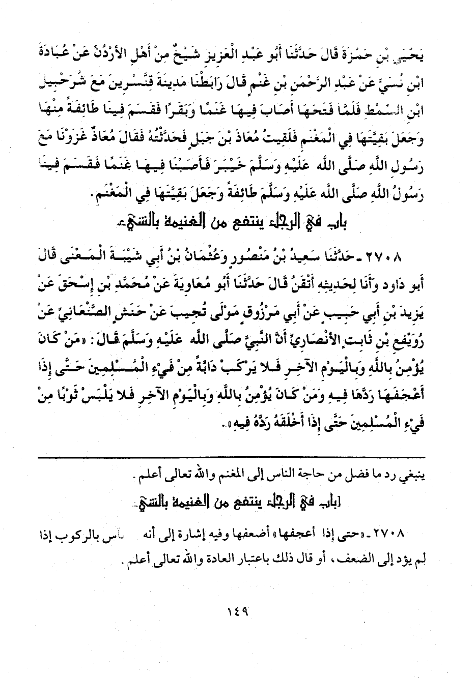 2708 - حَدَّثَنَا سَعِيدُ بْنُ مَنْصُورٍ، وَعُثْمَانُ بْنُ أَبِي شَيْبَةَ الْمَعْنَى - قَالَ أَبُو دَاوُدَ: وَأَنَا لِحَدِيثِهِ أَتْقَنُ - قَالَ: حَدَّثَنَا أَبُو مُعَاوِيَةَ، عَنْ مُحَمَّدِ بْنِ إِسْحَاقَ، عَنْ يَزِيدَ بْنِ أَبِي حَبِيبٍ، عَنْ أَبِي مَرْزُوقٍ مَوْلَى تُجِيبَ، عَنْ حَنَشٍ الصَّنْعَانِيِّ، عَنْ رُوَيْفِعِ بْنِ ثَابِتٍ الْأَنْصَارِيِّ، أَنَّ النَّبِيَّ صَلَّى اللهُ عَلَيْهِ وَسَلَّمَ قَالَ: «مَنْ كَانَ يُؤْمِنُ بِاللَّهِ وَبِالْيَوْمِ الْآخِرِ فَلَا يَرْكَبْ دَابَّةً مِنْ فَيْءِ الْمُسْلِمِينَ حَتَّى إِذَا أَعْجَفَهَا رَدَّهَا فِيهِ، وَمَنْ كَانَ يُؤْمِنُ بِاللَّهِ وَبِالْيَوْمِ الْآخِرِ فَلَا يَلْبَسْ ثَوْبًا مِنْ فَيْءِ الْمُسْلِمِينَ حَتَّى إِذَا أَخْلَقَهُ رَدَّهُ فِيهِ».