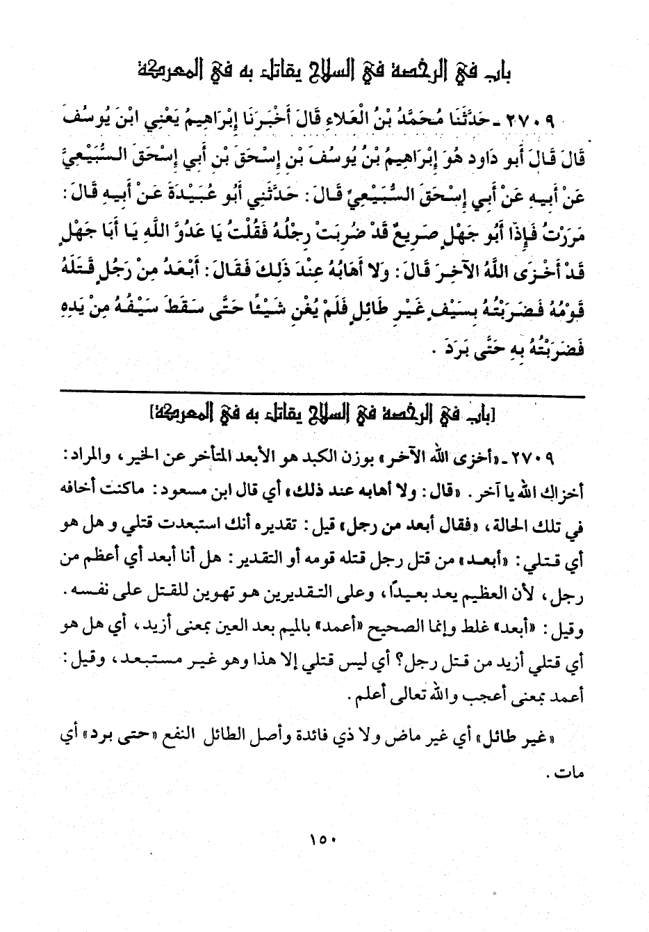 2709 - "أخزى الله الآخر" بوزن الكبد هو الأبعد المتأخر عن الخير، والمراد: أخزاك الله يا آخر. "قال: ولا أهابه عند ذلك" أي قال ابن مسعود: ما كنت أخافه في تلك الحالة، "فقال أبعد من رجل" قيل: تقديره أنك استبعدت قتلي وهل هو أي قتلي: "أبعد" من قتل رجل قتله قومه أو التقدير: هل أنا أبعد أي أعظم من رجل، لأن العظيم يعد بعيدًا، وعلى التقديرين هو تهوين للقتل على نفسه. وقيل: "أبعد" غلط وإنما الصحيح "أعمد" بالميم بعد العين بمعنى أزيد، أي هل هو أي قتلي أزيد من قتل رجل؟ أي ليس قتلي إلا هذا وهو غير مستبعد، وقيل: أعمد بمعنى أعجب والله تعالى أعلم.