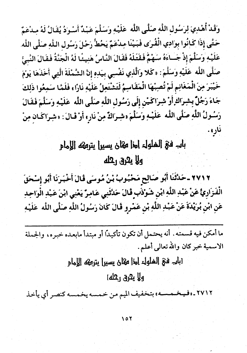 وَقَدْ أُهْدِيَ لِرَسُولِ اللَّهِ صَلَّى اللهُ عَلَيْهِ وَسَلَّمَ عَبْدٌ أَسْوَدُ يُقَالُ لَهُ مِدْعَمٌ حَتَّى إِذَا كَانُوا بِوَادِي الْقُرَى، فَبَيْنَا مِدْعَمٌ يحُطُّ رَحْلَ رَسُولِ اللَّهِ صَلَّى اللهُ عَلَيْهِ وَسَلَّمَ إِذْ جَاءَهُ سَهْمٌ فَقَتَلَهُ، فَقَالَ النَّاسُ: هَنِيئًا لَهُ الْجَنَّةُ، فَقَالَ النَّبِيُّ صَلَّى اللهُ عَلَيْهِ وَسَلَّمَ: «كَلَّا وَالَّذِي نَفْسِي بِيَدِهِ، إِنَّ الشَّمْلَةَ الَّتِي أَخَذَهَا يَوْمَ خَيْبَرَ مِنَ المَغَانِمِ لَمْ تُصِبْهَا الْمَقَاسِمُ لَتَشْتَعِلُ عَلَيْهِ نَارًا». فَلَمَّا سَمِعُوا ذَلِكَ جَاءَ رَجُلٌ بِشِرَاكٍ أَوْ شِرَاكَيْنِ إِلَى رَسُولِ اللَّهِ صَلَّى اللهُ عَلَيْهِ وَسَلَّمَ فَقَالَ رَسُولُ اللَّهِ صَلَّى اللهُ عَلَيْهِ وَسَلَّمَ: «شِرَاكٌ مِنْ نَارٍ» أَوْ قَالَ: «شِرَاكَانِ مِنْ نَارٍ».