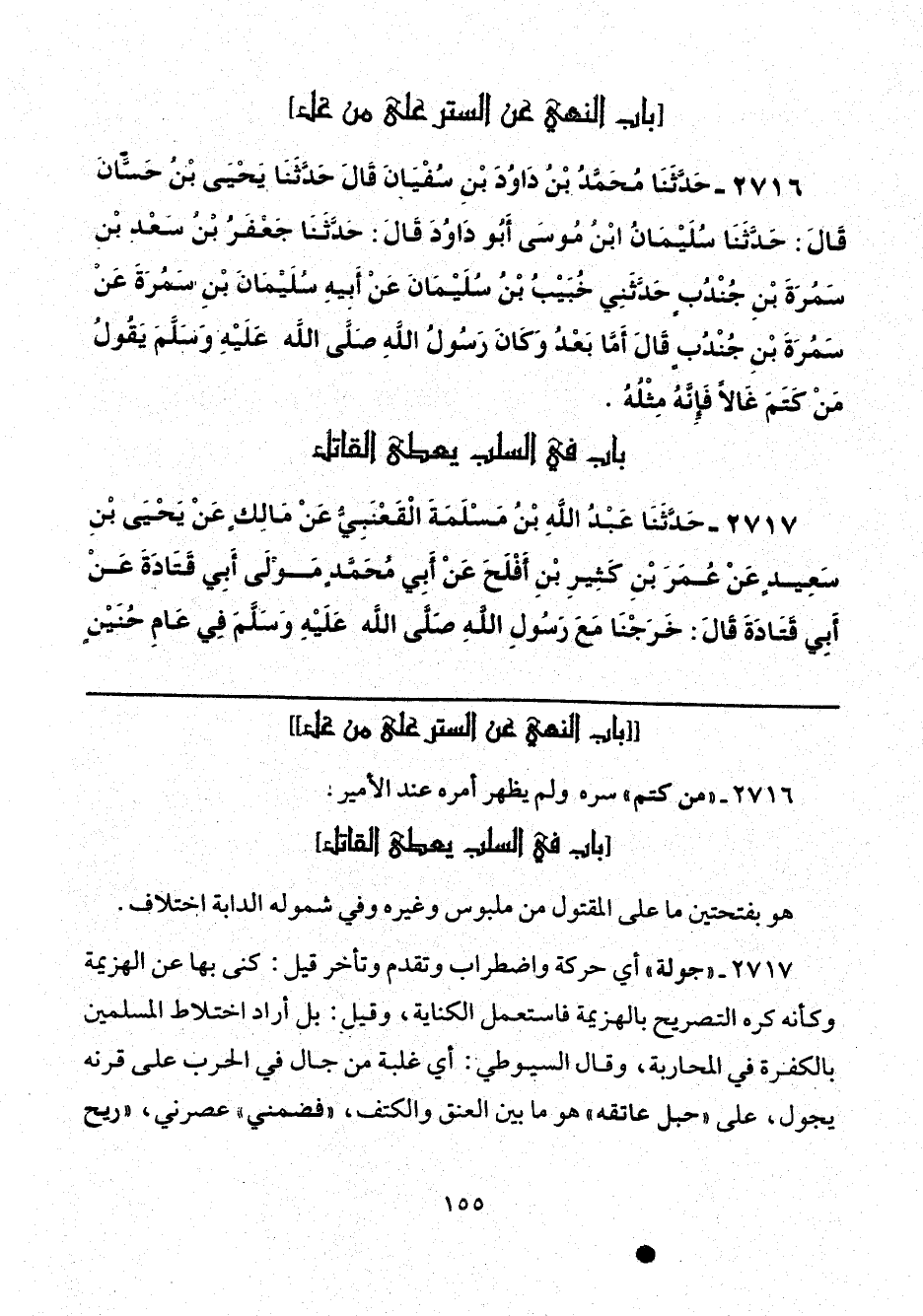 2717 - "جولة" أي حركة واضطراب وتقدم وتأخر قيل: كنى بها عن الهزيمة وكأنه كره التصريح بالهزيمة فاستعمل الكناية، وقيل: بل أراد اختلاط المسلمين بالكفرة في المحاربة، وقال السيوطي: أي غلبة من جال في الحرب على قرنه يجول، على "حبل عاتقه" هو ما بين العنق والكتف، "فضمني" عصرني، "ريح
