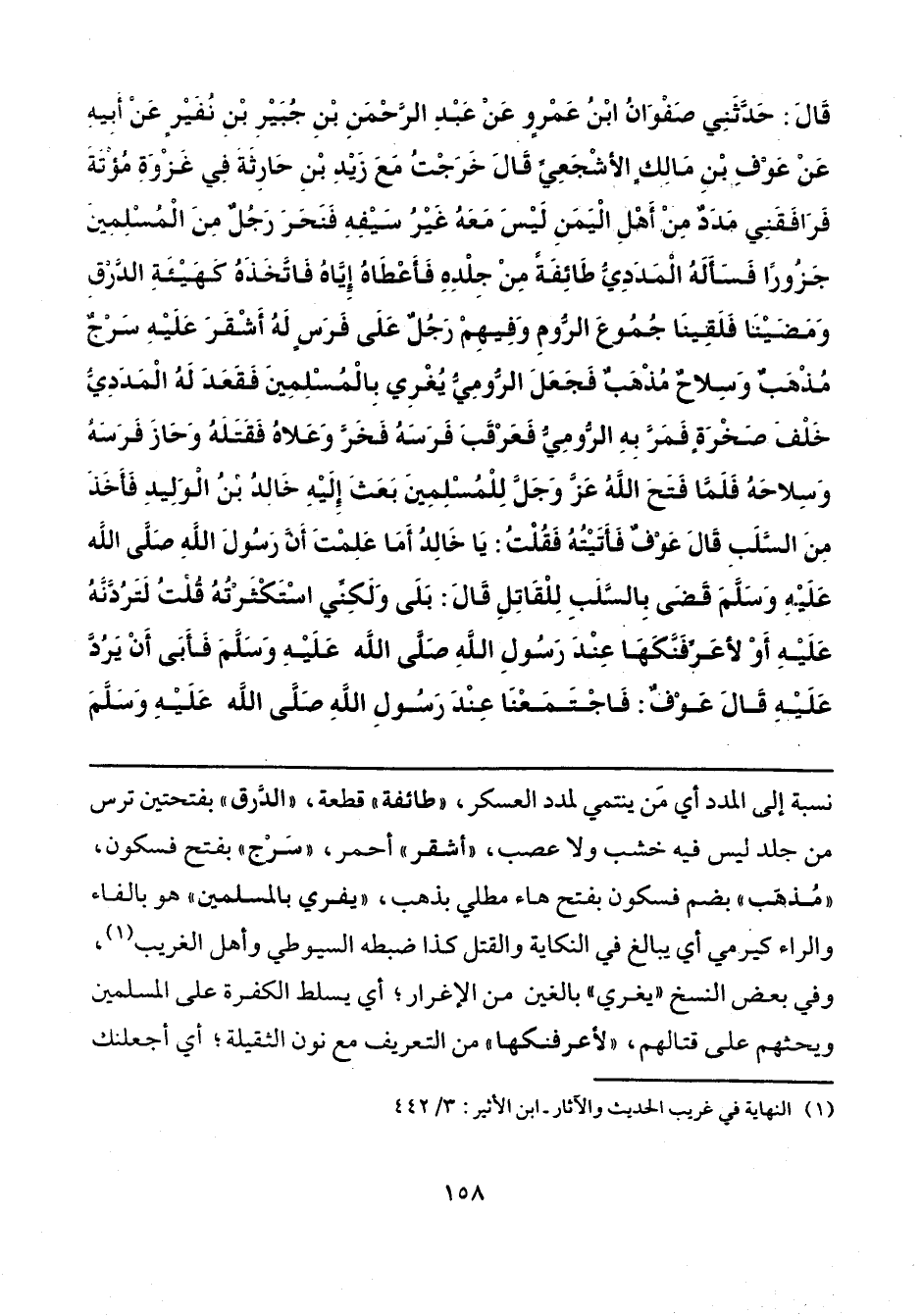 قَالَ: حَدَّثَنِي صَفْوَانُ بْنُ عَمْرٍو، عَنْ عَبْدِ الرَّحْمَنِ بْنِ جُبَيْرِ بْنِ نُفَيْرٍ، عَنْ أَبِيهِ، عَنْ عَوْفِ بْنِ مَالِكٍ الْأَشْجَعِيِّ، قَالَ: خَرَجْتُ مَعَ زَيْدِ بْنِ حَارِثَةَ فِي غَزْوَةِ مُؤْتَةَ فَرَافَقَنِي مَدَدٌ مِنْ أَهْلِ الْيَمَنِ لَيْسَ مَعَهُ غَيْرُ سَيْفِهِ، فَنَحَرَ رَجُلٌ مِنَ الْمُسْلِمِينَ جَزُورًا فَسَأَلَهُ الْمَدَدِيُّ طَائِفَةً مِنْ جِلْدِهِ فَأَعْطَاهُ إِيَّاهُ، فَاتَّخَذَهُ كَهَيْئَةِ الدَّرْقِ وَمَضَيْنَا فَلَقِينَا جُمُوعَ الرُّومِ وَفِيهِمْ رَجُلٌ عَلَى فَرَسٍ لَهُ أَشْقَرَ عَلَيْهِ سَرْجٌ مُذْهَبٌ وَسِلَاحٌ مُذْهَبٌ، فَجَعَلَ الرُّومِيُّ يُغْرِي بِالْمُسْلِمِينَ، فَقَعَدَ لَهُ الْمَدَدِيُّ خَلْفَ صَخْرَةٍ فَمَرَّ بِهِ الرُّومِيُّ فَعَرْقَبَ فَرَسَهُ فَخَرَّ وَعَلَاهُ فَقَتَلَهُ وَحَازَ فَرَسَهُ وَسِلَاحَهُ، فَلَمَّا فَتَحَ اللَّهُ عَزَّ وَجَلَّ لِلْمُسْلِمِينَ بَعَثَ إِلَيْهِ خَالِدُ بْنُ الْوَلِيدِ فَأَخَذَ مِنَ السَّلَبِ. قَالَ عَوْفٌ: فَأَتَيْتُهُ فَقُلْتُ: يَا خَالِدُ أَمَا عَلِمْتَ أَنَّ رَسُولَ اللَّهِ صَلَّى اللهُ عَلَيْهِ وَسَلَّمَ قَضَى بِالسَّلَبِ لِلْقَاتِلِ؟ قَالَ: بَلَى، وَلَكِنِّي اسْتَكْثَرْتُهُ. قُلْتُ: لَتَرُدَّنَّهُ عَلَيْهِ أَوْ لَأُعَرِّفَنَّكَهَا عِنْدَ رَسُولِ اللَّهِ صَلَّى اللهُ عَلَيْهِ وَسَلَّمَ، فَأَبَى أَنْ يَرُدَّ عَلَيْهِ قَالَ عَوْفٌ: فَاجْتَمَعْنَا عِنْدَ رَسُولِ اللَّهِ صَلَّى اللهُ عَلَيْهِ وَسَلَّمَ