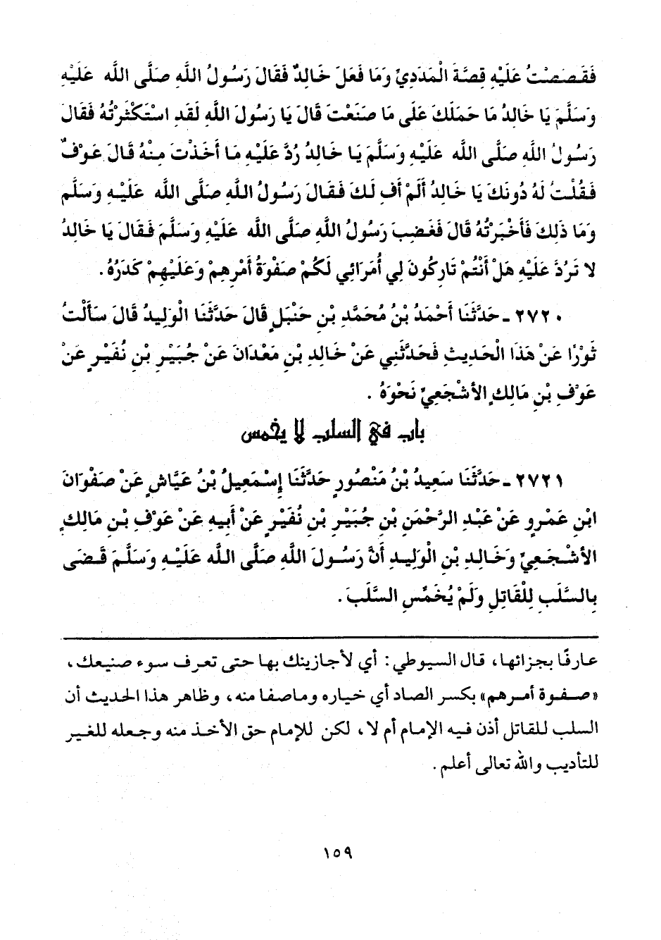 فَقَصَصْتُ عَلَيْهِ قِصَّةَ الْمَدَدِيِّ وَمَا فَعَلَ خَالِدٌ، فَقَالَ رَسُولُ اللَّهِ صَلَّى اللهُ عَلَيْهِ وَسَلَّمَ: «يَا خَالِدُ مَا حَمَلَكَ عَلَى مَا صَنَعْتَ؟ » قَالَ: يَا رَسُولَ اللَّهِ لَقَدِ اسْتَكْثَرْتُهُ. فَقَالَ رَسُولُ اللَّهِ صَلَّى اللهُ عَلَيْهِ وَسَلَّمَ: «يَا خَالِدُ رُدَّ عَلَيْهِ مَا أَخَذْتَ مِنْهُ». قَالَ عَوْفٌ: فَقُلْتُ لَهُ: دُونَكَ يَا خَالِدُ، أَلَمْ أَفِ لَكَ؟ فَقَالَ رَسُولُ اللَّهِ صَلَّى اللهُ عَلَيْهِ وَسَلَّمَ: «وَمَا ذَلِكَ؟ » فَأَخْبَرْتُهُ قَالَ: فَغَضِبَ رَسُولُ اللَّهِ صَلَّى اللهُ عَلَيْهِ وَسَلَّمَ فَقَالَ: «يَا خَالِدُ لَا تَرُدَّ عَلَيْهِ، هَلْ أَنْتُمْ تَارِكُونَ لِي أُمَرَائِي؟ لَكُمْ صَفْوَةُ أَمْرِهِمْ وَعَلَيْهِمْ كَدَرُهُ».