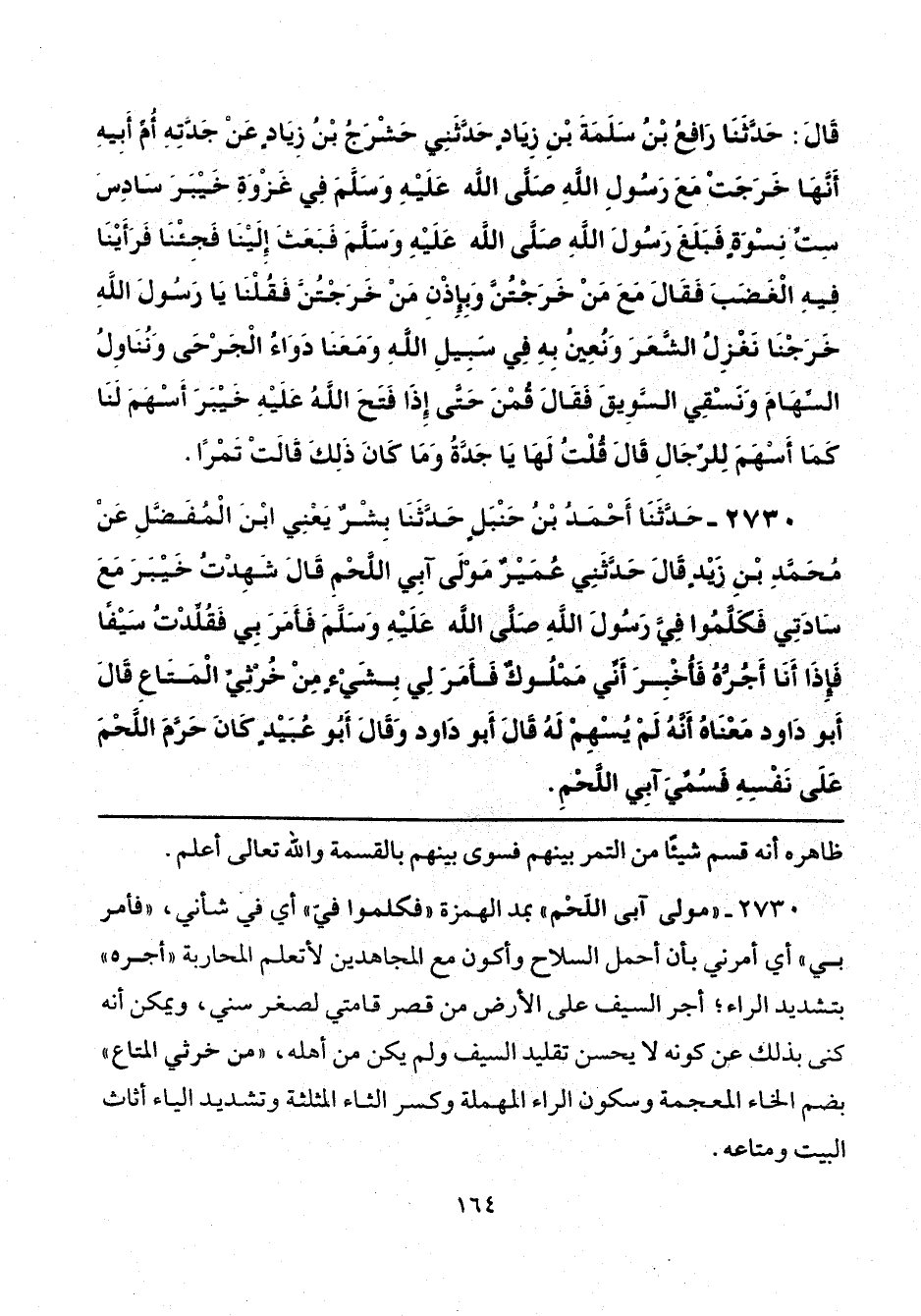 2730 - حَدَّثَنَا أَحْمَدُ بْنُ حَنْبَلٍ، حَدَّثَنَا بِشْرٌ يَعْنِي ابْنَ الْمُفَضَّلِ، عَنْ مُحَمَّدِ بْنِ زَيْدٍ، قَالَ حَدَّثَنِي عُمَيْرٌ مَوْلَى آبِي اللَّحْمِ، قَالَ: «شَهِدْتُ خَيْبَرَ مَعَ سَادَتِي، فَكَلَّمُوا فِيَّ رَسُولَ اللَّهِ صَلَّى اللهُ عَلَيْهِ وَسَلَّمَ فَأَمَرَ بِي فَقُلِّدْتُ سَيْفًا، فَإِذَا أَنَا أَجُرُّهُ فَأُخْبِرَ أَنِّي مَمْلُوكٌ، فَأَمَرَ لِي بِشَيْءٍ مِنْ خُرْثِيِّ الْمَتَاعِ» قَالَ أَبُو دَاوُدَ: «مَعْنَاهُ أَنَّهُ لَمْ يُسْهِمْ لَهُ» قَالَ أَبُو دَاوُدَ: وَقَالَ أَبُو عُبَيْدٍ: «كَانَ حَرَّمَ اللَّحْمَ عَلَى نَفْسِهِ فَسُمِّيَ آبِي اللَّحْمِ».