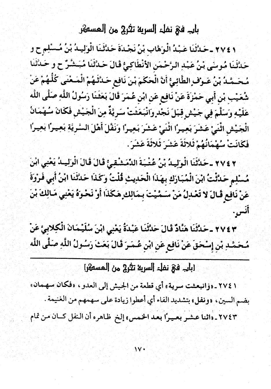 2741 - حَدَّثَنَا عَبْدُ الْوَهَّابِ بْنُ نَجْدَةَ، حَدَّثَنَا الْوَلِيدُ بْنُ مُسْلِمٍ، ح وحَدَّثَنَا مُوسَى بْنُ عَبْدِ الرَّحْمَنِ الْأَنْطَاكِيُّ، قَالَ: حَدَّثَنَا مُبَشَّرٌ، ح وحَدَّثَنَا مُحَمَّدُ بْنُ عَوْفٍ الطَّائِيُّ، أَنَّ الْحَكَمَ بْنَ نَافِعٍ، حَدَّثَهُمُ الْمَعْنَى، كُلُّهُمْ عَنْ شُعَيْبِ بْنِ أَبِي حَمْزَةَ، عَنْ نَافِعٍ، عَنِ ابْنِ عُمَرَ، قَالَ: «بَعَثَنَا رَسُولُ اللَّهِ صَلَّى اللهُ عَلَيْهِ وَسَلَّمَ فِي جَيْشٍ قِبَلَ نَجْدٍ، وَانْبَعَثَتْ سَرِيَّةٌ مِنَ الْجَيْشِ، فَكَانَ سُهْمَانُ الْجَيْشِ اثْنَيْ عَشَرَ بَعِيرًا، اثْنَيْ عَشَرَ بَعِيرًا، وَنَفَّلَ أَهْلَ السَّرِيَّةِ بَعِيرًا بَعِيرًا، فَكَانَتْ سُهْمَانُهُمْ ثَلَاثَةَ عَشَرَ، ثَلَاثَةَ عَشَرَ».