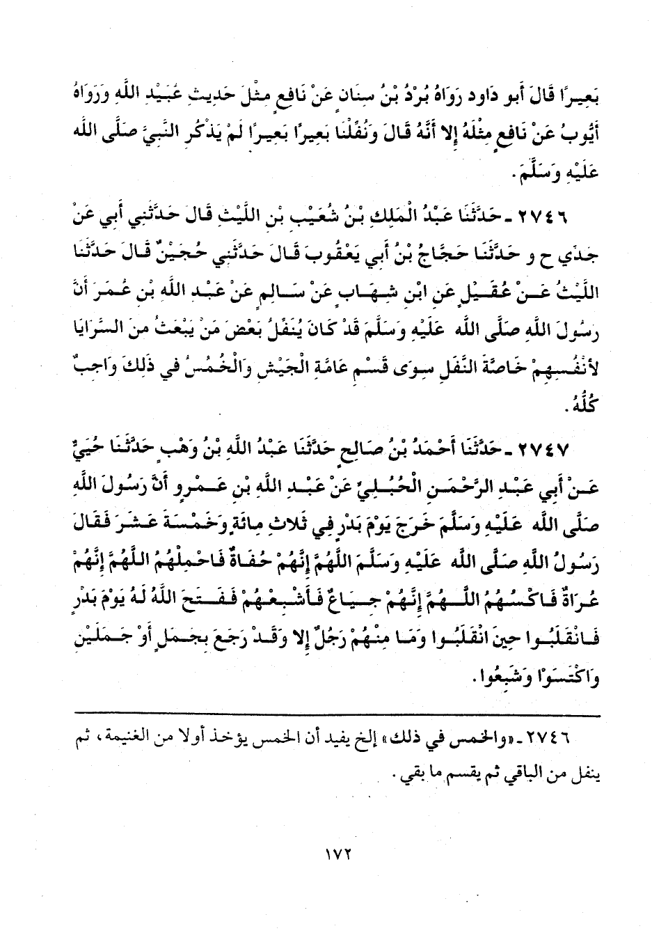 2746 - حَدَّثَنَا عَبْدُ الْمَلِكِ بْنُ شُعَيْبِ بْنِ اللَّيْثِ، قَالَ: حَدَّثَنِي أَبِي، عَنْ جَدِّي، ح وحَدَّثَنَا حَجَّاجُ بْنُ أَبِي يَعْقُوبَ، قَالَ: حَدَّثَنِي حُجَيْنٌ، قَالَ: حَدَّثَنَا اللَّيْثُ، عَنْ عُقَيْلٍ، عَنِ ابْنِ شِهَابٍ، عَنْ سَالِمٍ، عَنْ عَبْدِ اللَّهِ بْنِ عُمَرَ، «أَنَّ رَسُولَ اللَّهِ صَلَّى اللهُ عَلَيْهِ وَسَلَّمَ قَدْ كَانَ يُنَفِّلُ بَعْضَ مَنْ يَبْعَثُ مِنَ السَّرَايَا لِأَنْفُسِهِمْ خَاصَّةَ النَّفَلِ سِوَى قَسْمِ عَامَّةِ الْجَيْشِ، وَالْخُمُسُ فِي ذَلِكَ وَاجِبٌ كُلُّهُ».