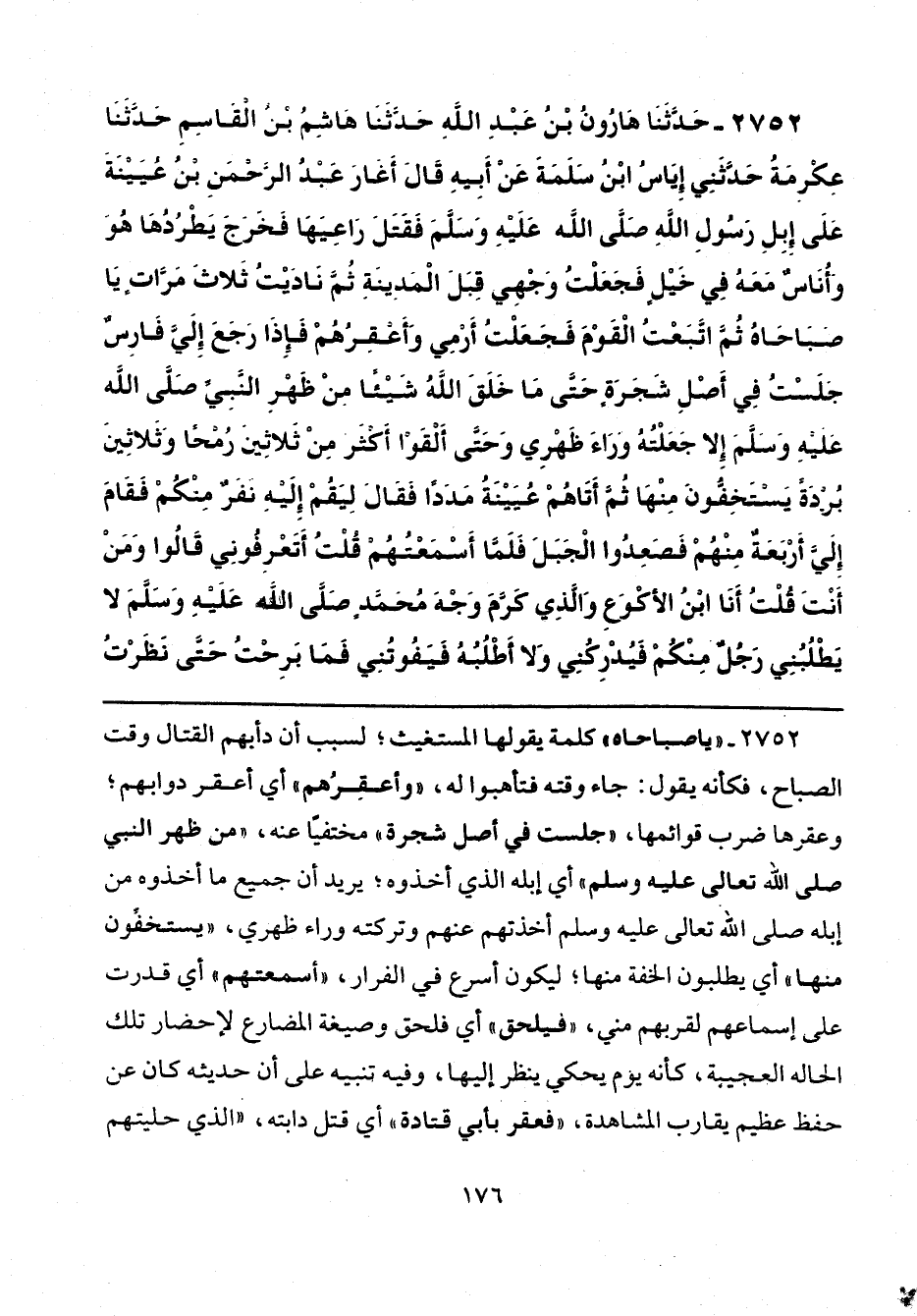 2752 - "يا صباحاه" كلمة يقولها المستغيث؛ لسبب أن دأبهم القتال وقت الصباح، فكأنه يقول: جاء وقته فتأهبوا له، "وأعقِرُهم" أي أعقر دوابهم؛ وعقرها ضرب قوائمها، "جلست في أصل شجرة" مختفيًا عنه، "من ظهر النبي صلى الله تعالى عليه وسلم" أي إبله الذي أخذوه؛ يريد أن جميع ما أخذوه من إبله صلى الله تعالى عليه وسلم أخذتهم عنهم وتركته وراء ظهري، "يستخفون منها" أي يطلبون الخفة منها؛ ليكون أسرع في الفرار، "أسمعتهم" أي قدرت علي إسماعهم لقربهم مني، "فيلحق" أي فلحق وصيغة المضارع لإحضار تلك الحاله العجيبة، كأنه يوم يحكي ينظر إليها، وفيه تنبيه على أن حديثه كان عن حفظ عظيم يقارب المشاهدة، "فعقر بأبي قتادة" أي قتل دابته، "الذي حليتهم