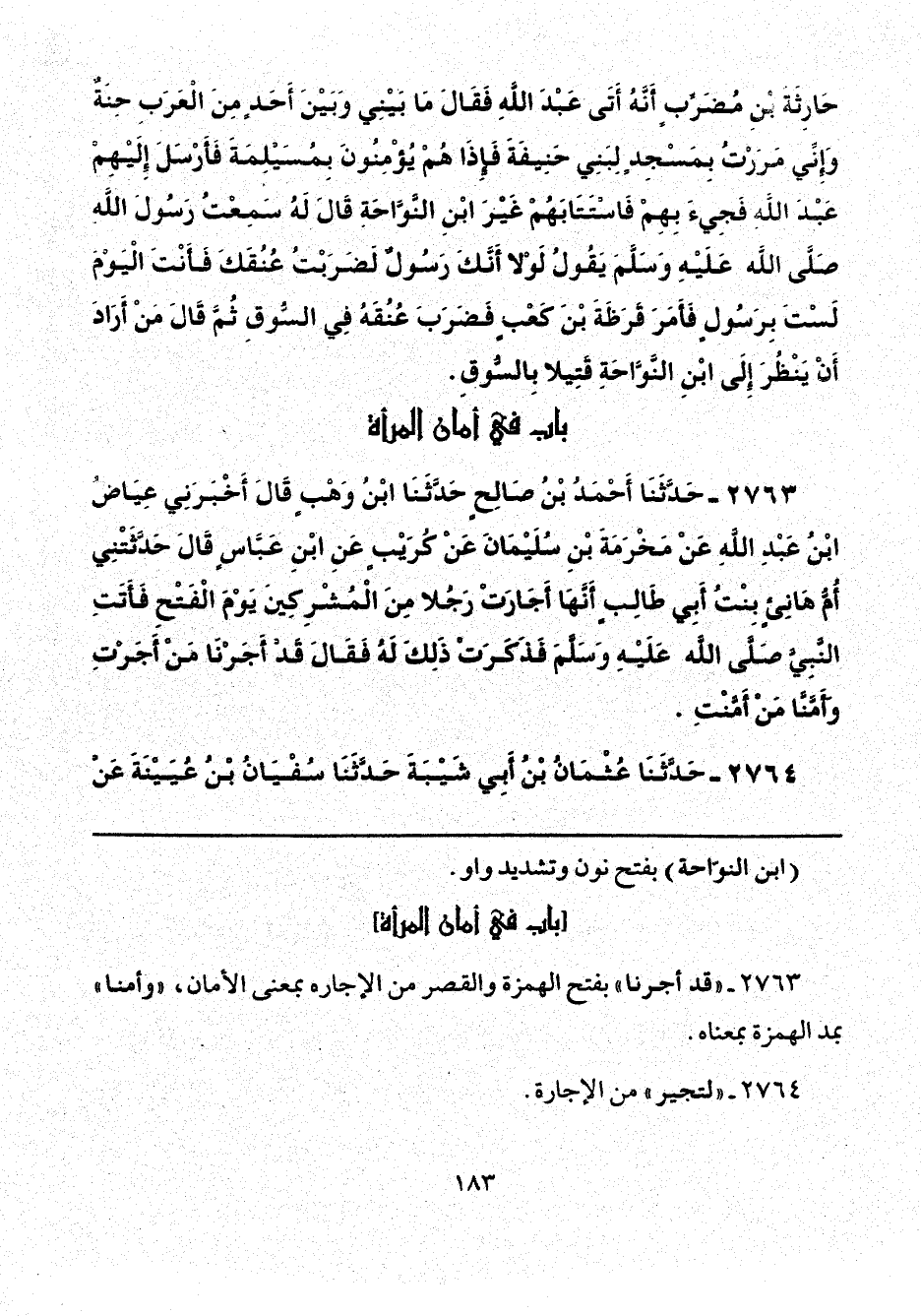 2763 - حَدَّثَنَا أَحْمَدُ بْنُ صَالِحٍ، حَدَّثَنَا ابْنُ وَهْبٍ، قَالَ: أَخْبَرَنِي عِيَاضُ بْنُ عَبْدِ اللَّهِ، عَنْ مَخْرَمَةَ بْنِ سُلَيْمَانَ، عَنْ كُرَيْبٍ، عَنِ ابْنِ عَبَّاسٍ، قَالَ: حَدَّثَتْنِي أُمُّ هَانِئٍ بِنْتُ أَبِي طَالِبٍ، أَنَّهَا أَجَارَتْ رَجُلًا مِنَ الْمُشْرِكِينَ يَوْمَ الْفَتْحِ فَأَتَتِ النَّبِيَّ صَلَّى اللهُ عَلَيْهِ وَسَلَّمَ فَذَكَرَتْ ذَلِكَ لَهُ، فَقَالَ: «قَدْ أَجَرْنَا مَنْ أَجَرْتِ، وَأَمَّنَّا مَنْ أَمَّنْتِ».