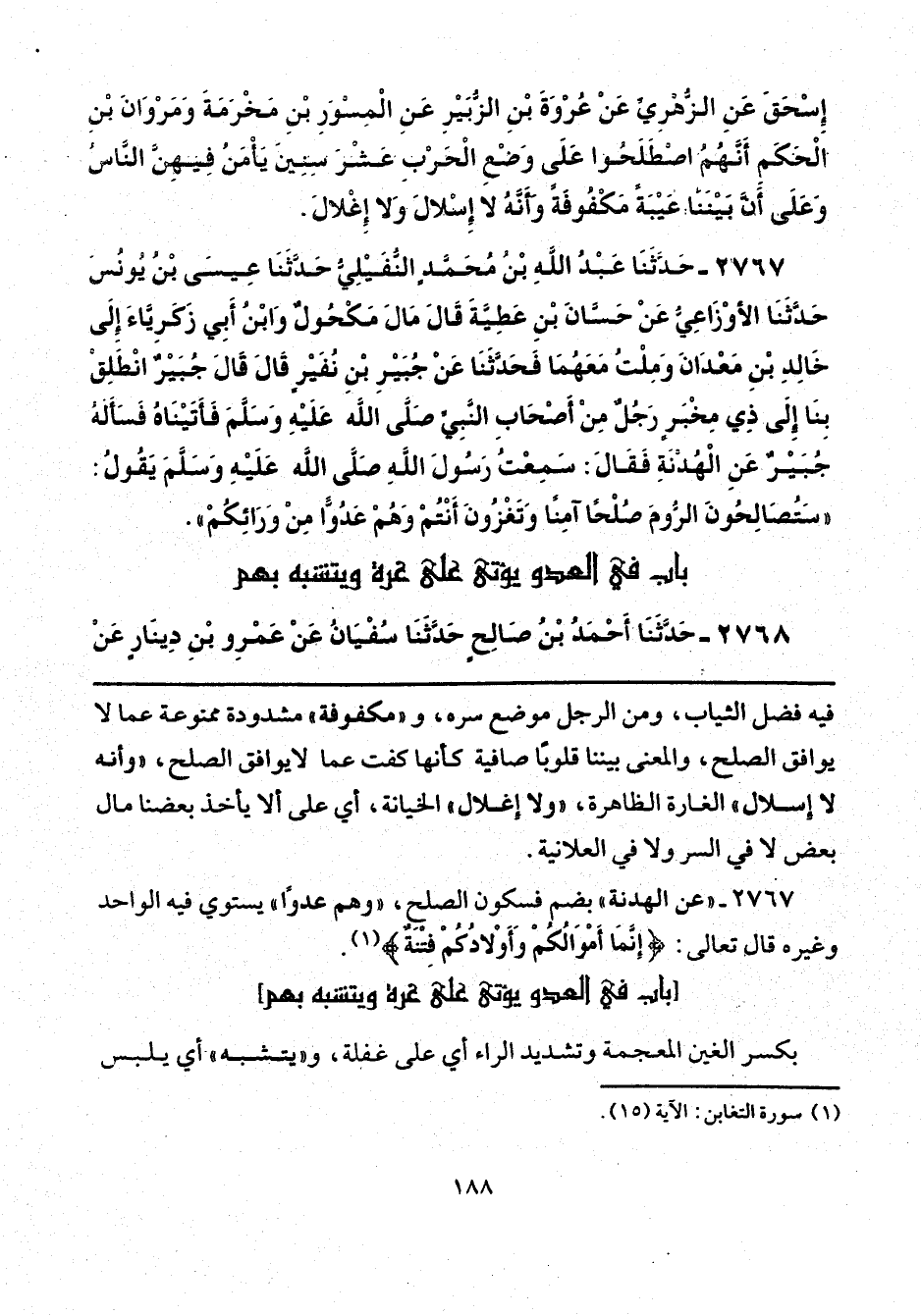 2767 - "عن الهُدْنة" بضم فسكون الصلح، "وهم عدوًا" يستوي فيه الواحد وغيره قالي تعالى: {إنَّمَا أَمْوَالُكُمْ وَأَوْلادُكمْ فِتْنَةٌ} (¬1).