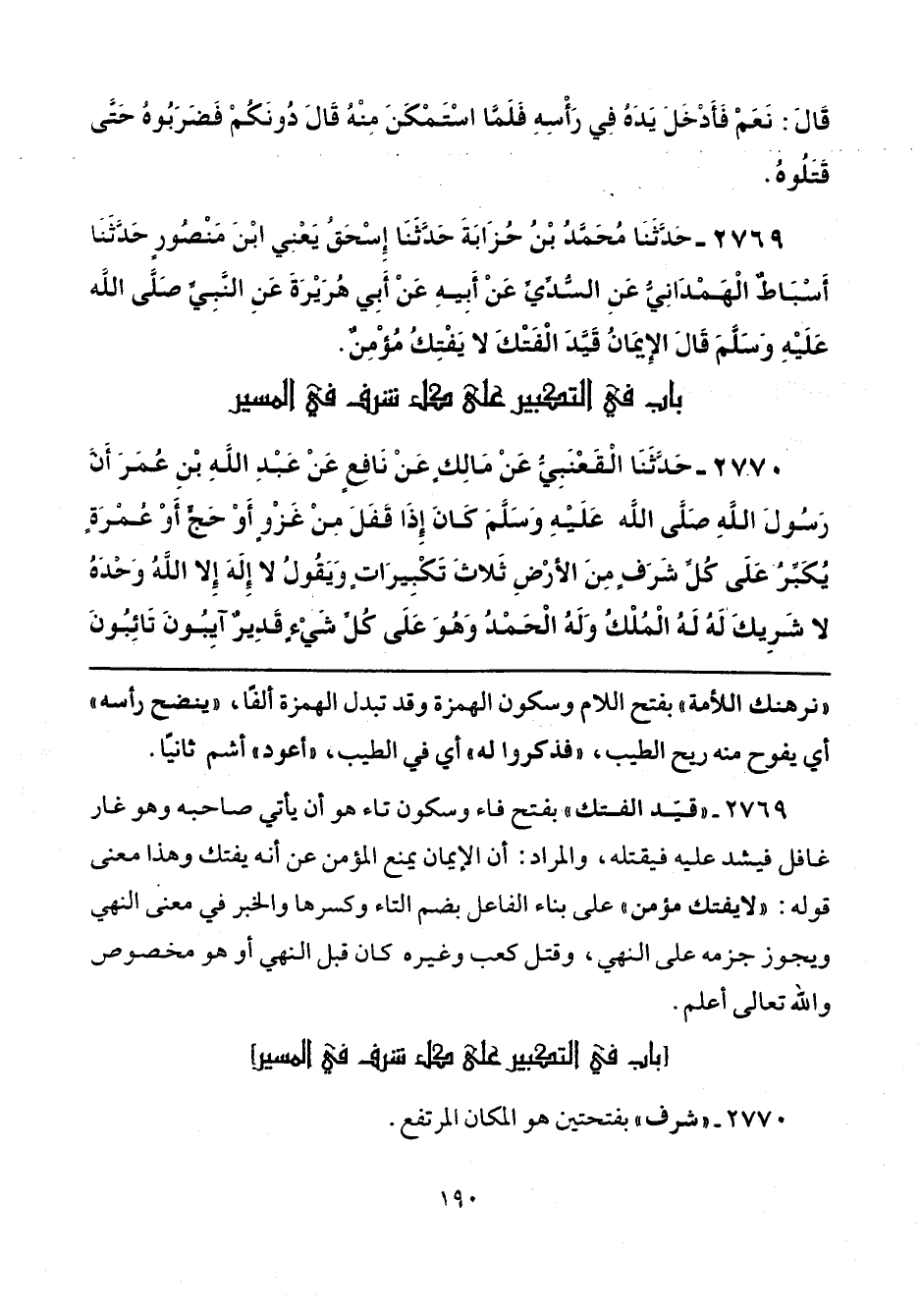 2769 - "قيّد الفَتْك" بفتح فاء وسكون تاء هو أن يأتي صاحبه وهو غار غافل فيشد عليه فيقتله، والمراد: أن الإيمان يمنع المؤمن عن أنه يفتك وهذا معنى قوله: "لا يفتك مؤمن" على بناء الفاعل بضم التاء وكسرها والخبر في معنى النهي ويجوز جزمه على النهي، وقتل كعب وغيره كان قبل النهي أو هو مخصوص والله تعالى أعلم.