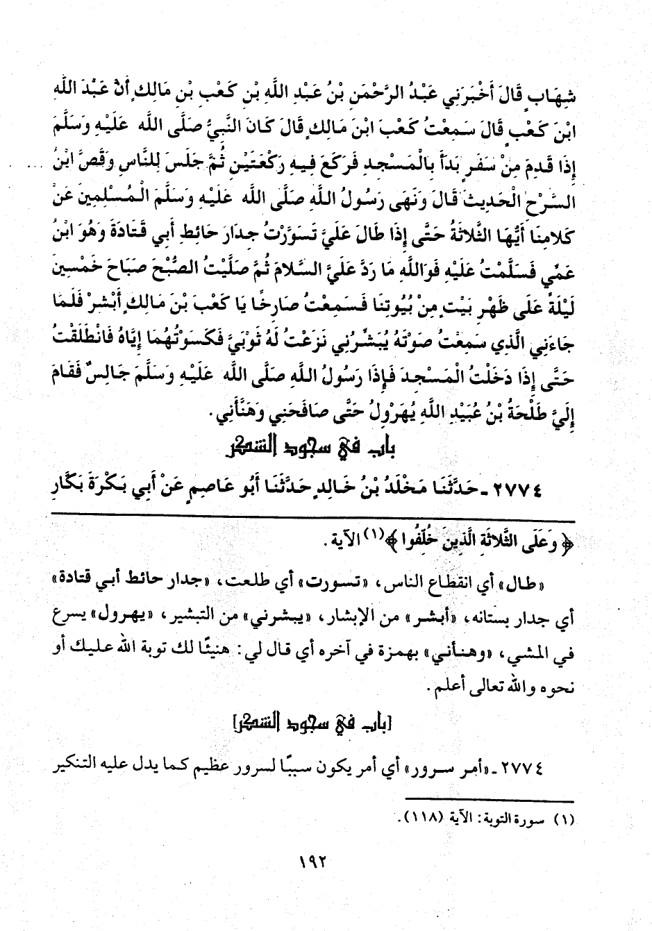 "طال" أي انقطاع الناس، "تسورت" أي طلعت، "جدار حائط أبي قتادة" أي جدار بشانه، "أبشر" من الإبشار، "يبشرني" من التبشير، "يهرول" يسرع في المشي، "وهنأني" بهمزة في آخره أي قال لي: هنيئًا لك توبة الله عليك أو نحوه والله تعالى أعلم.