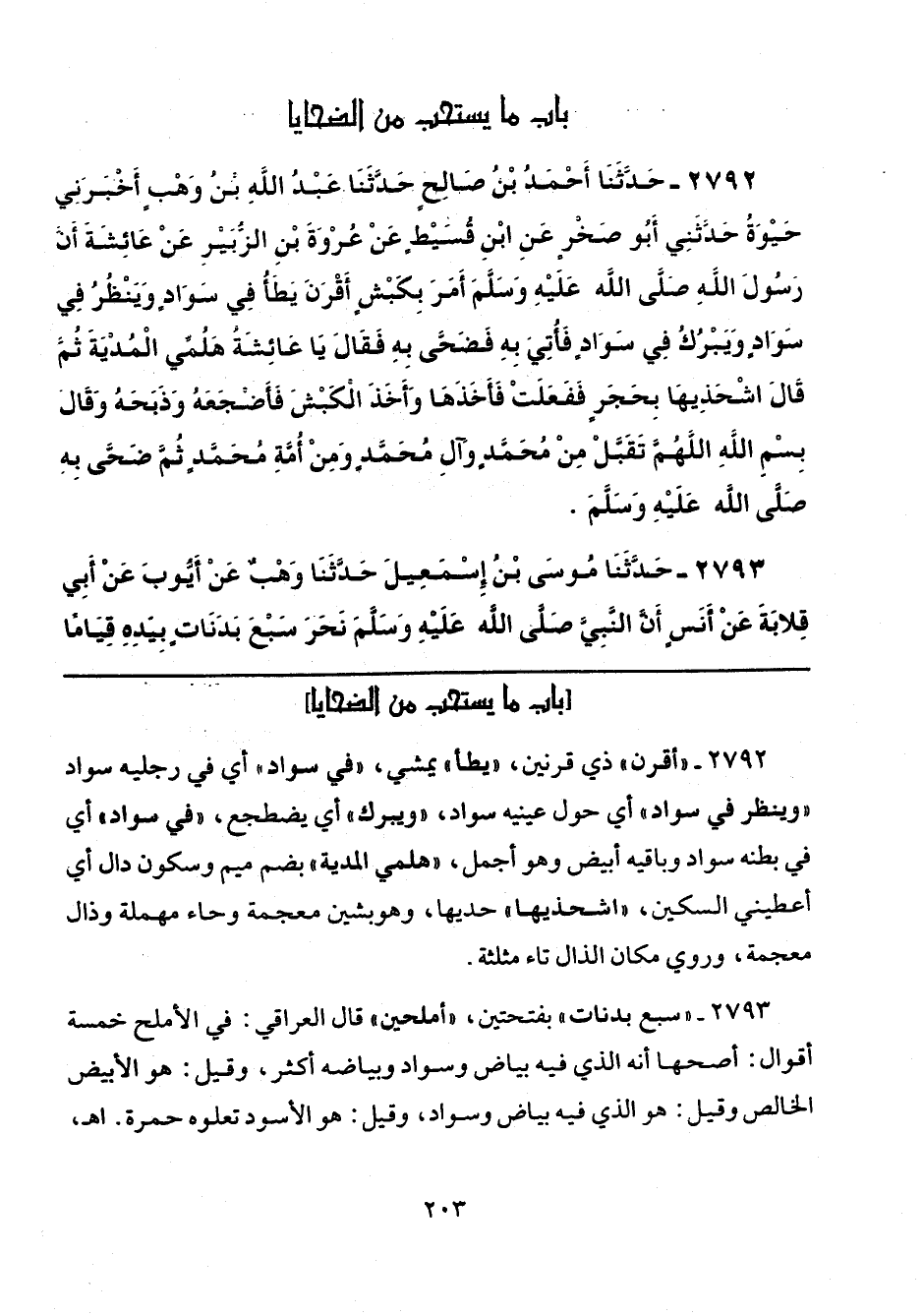 2792 - "أقرن" ذي قرنين، "يطأ" يمشي، "في سواد" أي في رجليه سواد "وينظر في سواد" أي حول عينيه سواد، "ويبرك" أي يضطجع، "في سواد" أي في بطنه سواد وباقيه أبيض وهو أجمل، "هلمي المُدْية" بضم ميم وسكون دال أي أعطيني السكين، "اشحذيها" حديها، وهوبشين معجمة وحاء مهملة وذال معجمة، وروي مكان الذال تاء مثلثة.