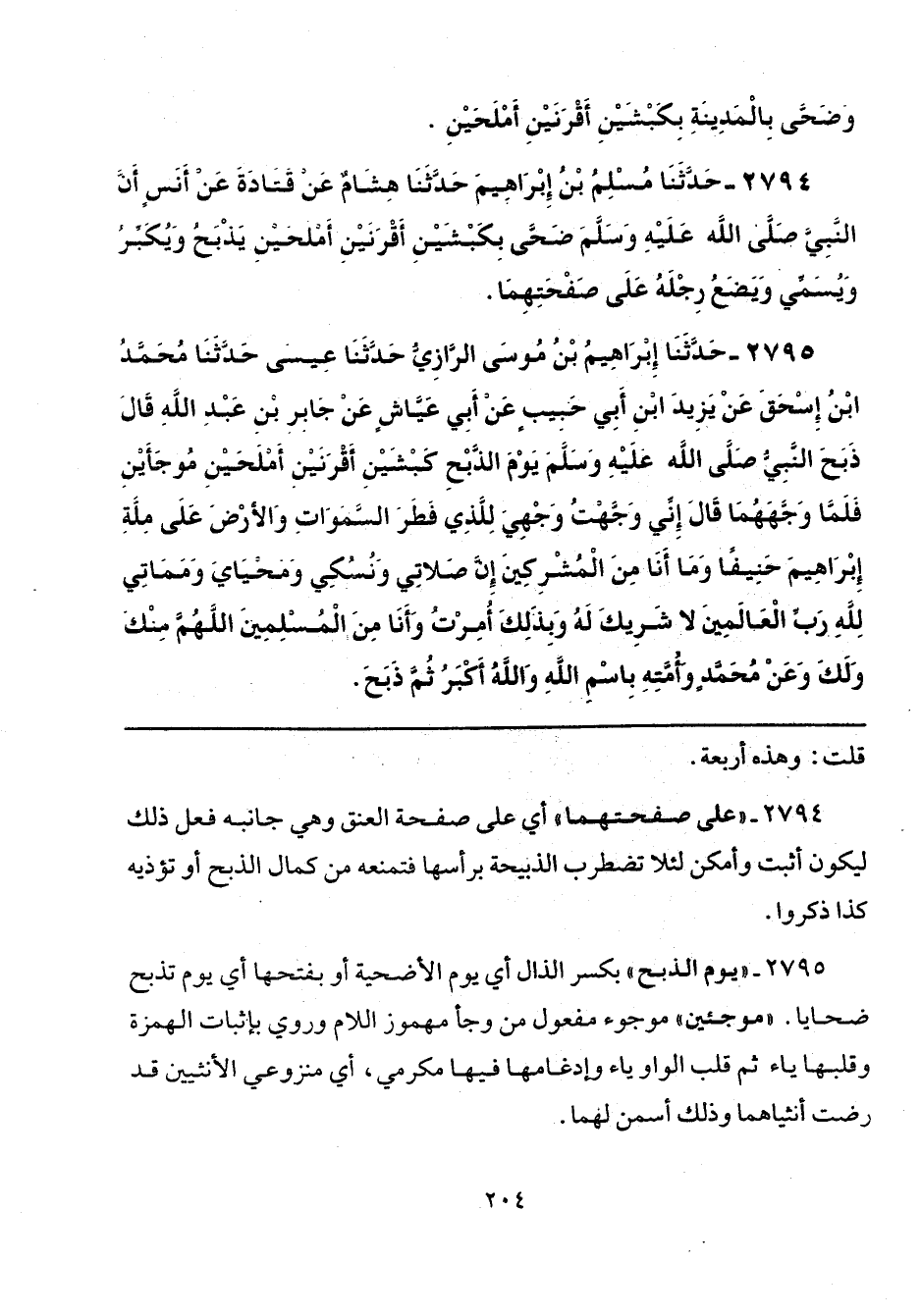 2794 - حَدَّثَنَا مُسْلِمُ بْنُ إِبْرَاهِيمَ، حَدَّثَنَا هِشَامٌ، عَنْ قَتَادَةَ، عَنْ أَنَسٍ أَنَّ النَّبِيَّ صَلَّى اللهُ عَلَيْهِ وَسَلَّمَ: «ضَحَّى بِكَبْشَيْنِ أَقْرَنَيْنِ أَمْلَحَيْنِ يَذْبَحُ وَيُكَبِّرُ وَيُسَمِّي وَيَضَعُ رِجْلَهُ عَلَى صَفْحَتِهِمَا».