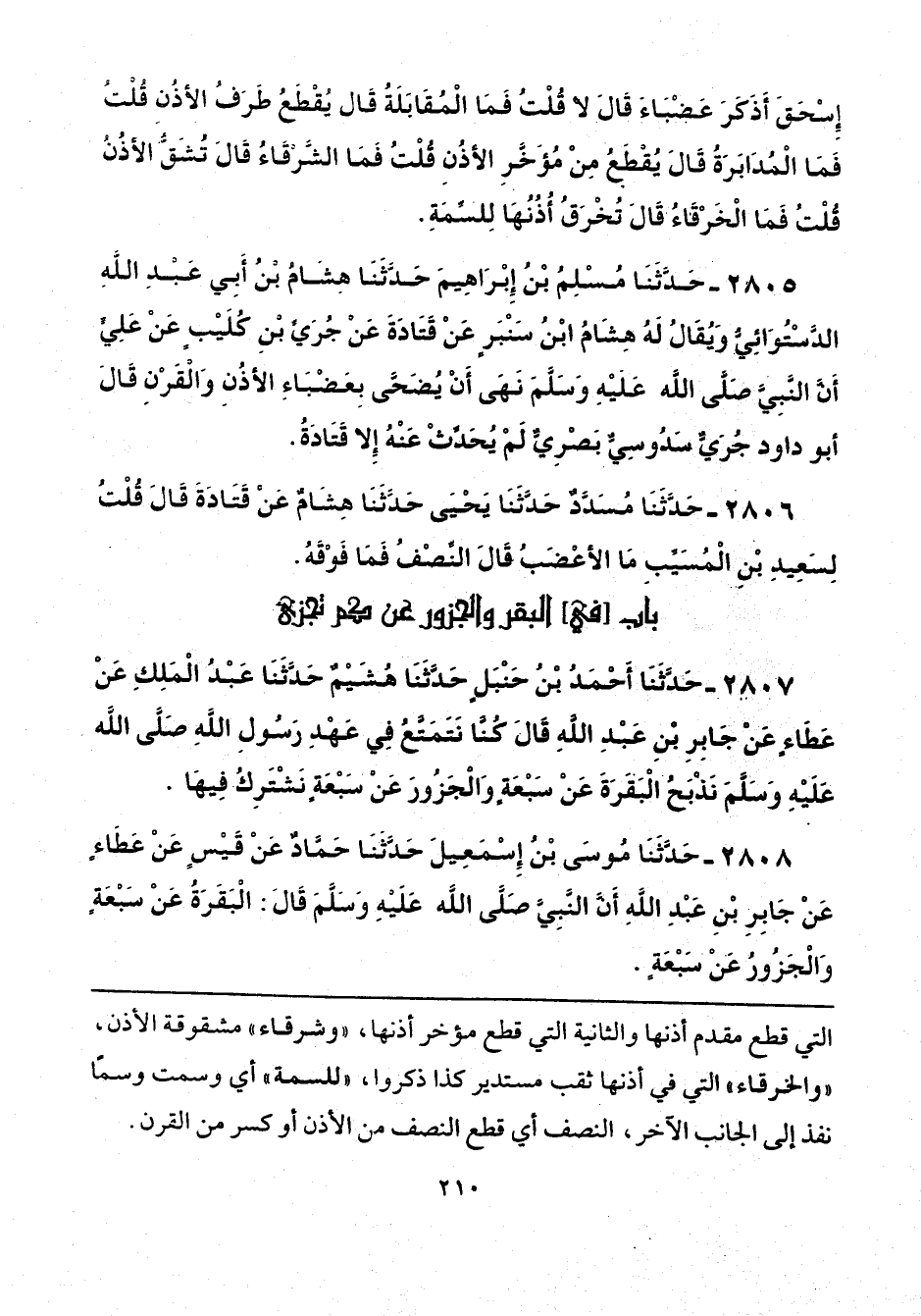 التي قطع مقدم أذنها والثانية التي قطع مؤخر أذنها، "وشرقاء" مشقوقة الأذن، "والخرقاء" التي في أذنها ثقب مستدير كذا ذكروا، "للسمة" أي وسمت وسمًا نفذ إلى الجانب الآخر، النصف أي قطع النصف من الأذن أو كسر من القرن.