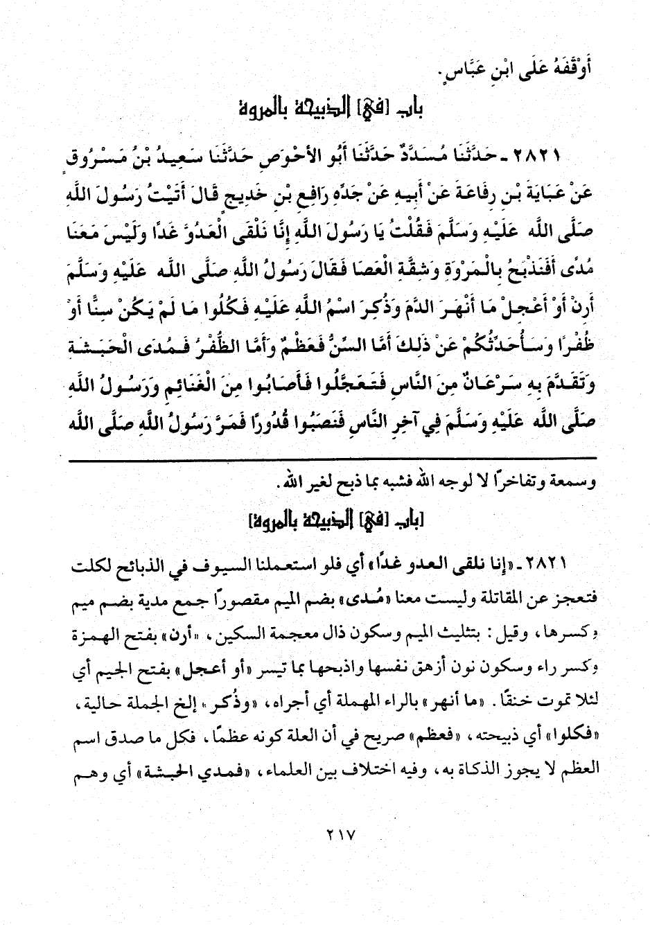 2821 - "إِنا نلقى العدو غدًا" أي فلو استعملنا السيوف في الذبائح لكلت فتعجز عن المقاتلة وليست معنا "مُدى" بضم الميم مقصورًا جمع مُدية بضم ميم وكسرها، وقيل: بتثليث الميم وسكون ذال معجمة السكين، "أَرن" بفتح الهىمزة وكسر راء وسكون نون أزهق نفسها واذبحها بما تيسر "أو أعجل" بفتح الجيم أي لئلا تموت خناقًا. "ما أنهر" بالراء المهملة أي أجراه، "وذُكر" إلخ الجملة حالية، "فكلوا" أي ذبيحته، "فعظم" صريح في أن العلة كونه عظمًا، فكل ما صدق اسم العظم لا يجوز الذكاة به، وفيه اختلاف بين العلماء، "مدي الحبشة" أي وهم