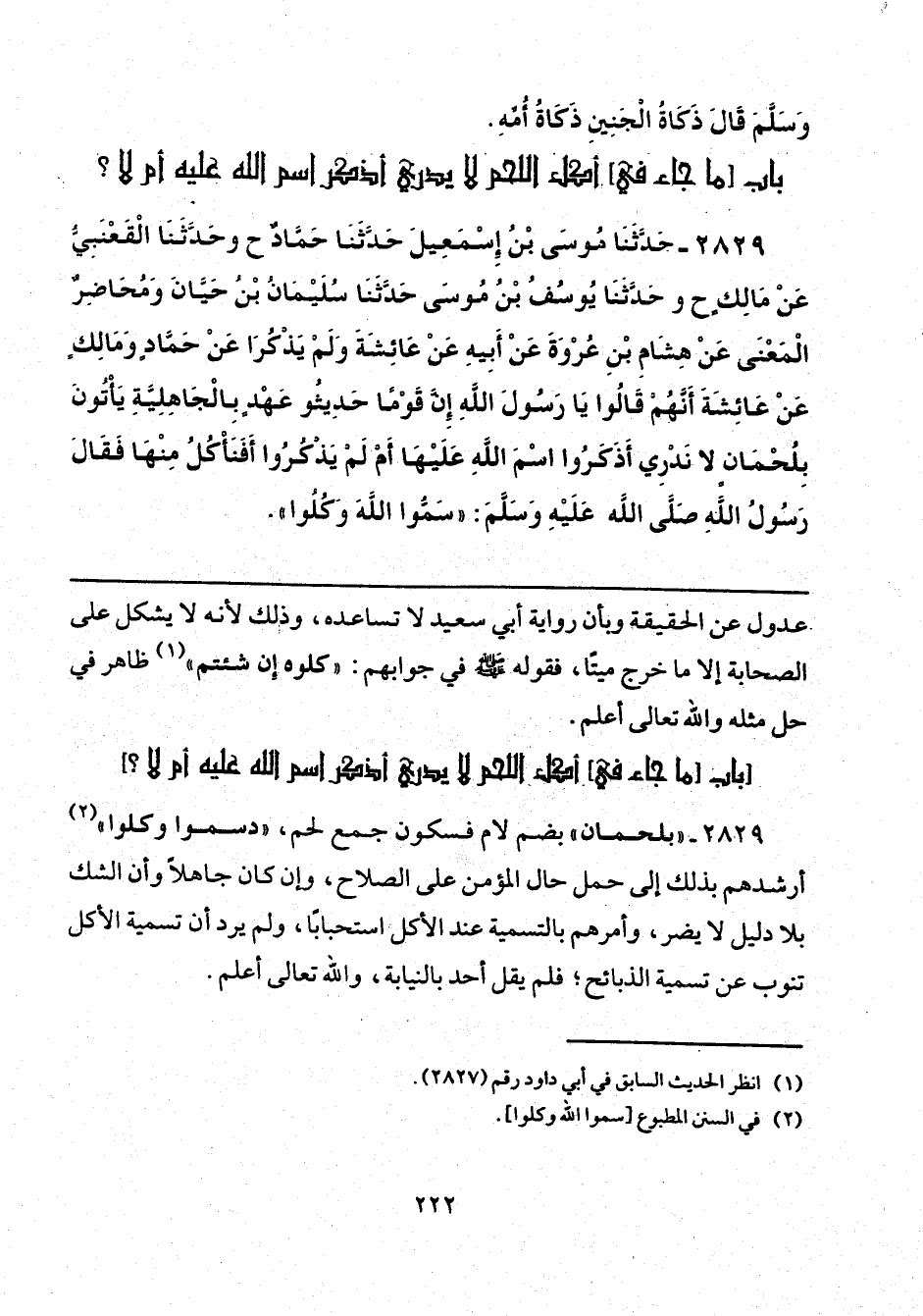 2829 - حَدَّثَنَا مُوسَى بْنُ إِسْمَاعِيلَ، حَدَّثَنَا حَمَّادٌ، ح وحَدَّثَنَا الْقَعْنَبِيُّ، عَنْ مَالِكٍ، ح وحَدَّثَنَا يُوسُفُ بْنُ مُوسَى، حَدَّثَنَا سُلَيْمَانُ بْنُ حَيَّانَ، وَمُحَاضِرٌ الْمَعْنَى، عَنْ هِشَامِ بْنِ عُرْوَةَ، عَنْ أَبِيهِ، عَنْ عَائِشَةَ، وَلَمْ يَذْكُرَا عَنْ حَمَّادٍ، وَمَالِكٍ، عَنْ عَائِشَةَ أَنَّهُمْ قَالُوا: يَا رَسُولَ اللَّهِ إِنَّ قَوْمًا حَدِيثُو عَهْدٍ بِالْجَاهِلِيَّةِ يَأْتُونَ بِلُحْمَانٍ لَا نَدْرِي أَذَكَرُوا اسْمَ اللَّهِ عَلَيْهَا أَمْ لَمْ يَذْكُرُوا، أَفَنَأْكُلُ مِنْهَا؟ فَقَالَ رَسُولُ اللَّهِ صَلَّى اللهُ عَلَيْهِ وَسَلَّمَ: «سَمُّوا اللَّهَ وَكُلُوا».