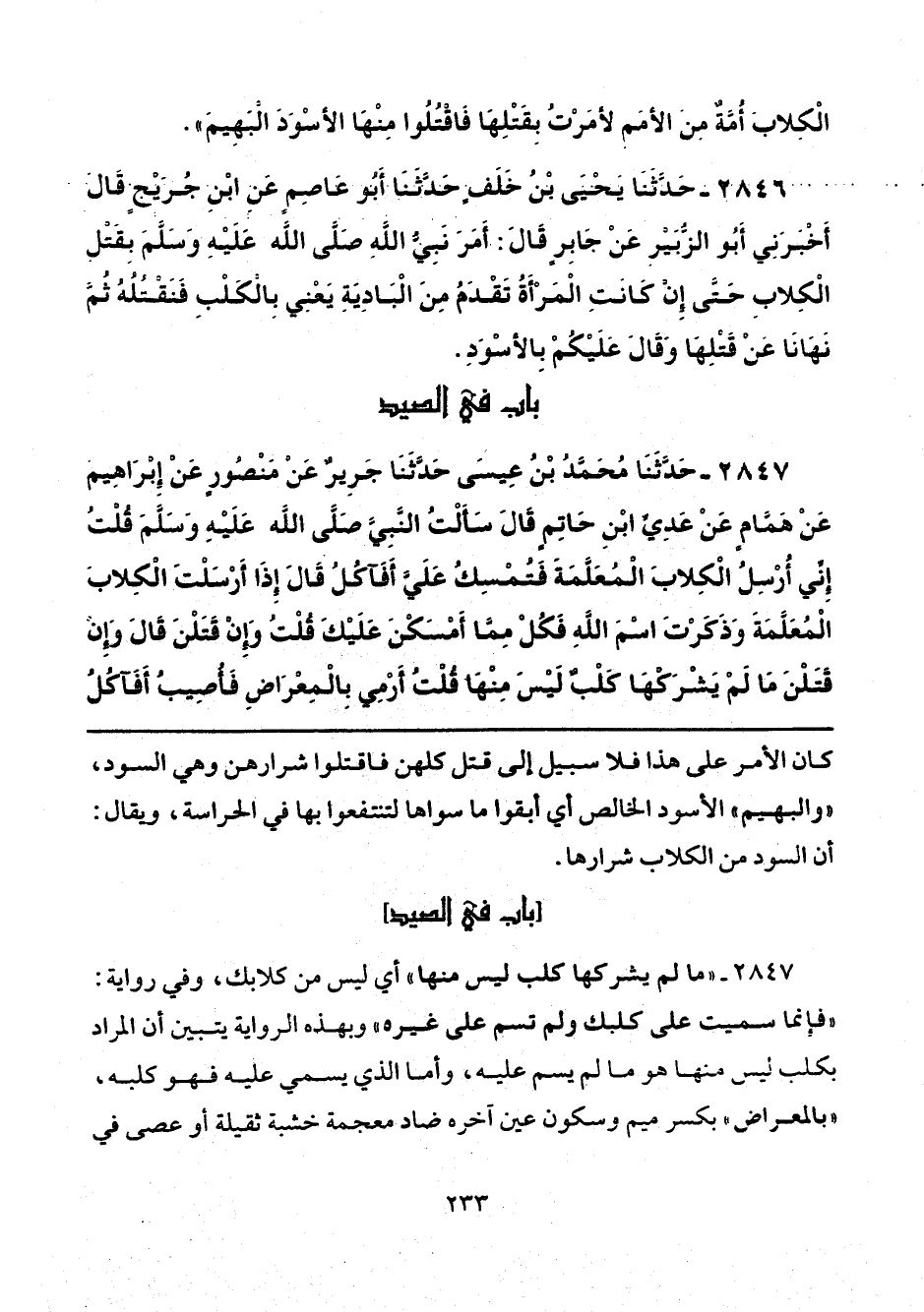 2847 - حَدَّثَنَا مُحَمَّدُ بْنُ عِيسَى حَدَّثَنَا جَرِيرٌ عَنْ مَنْصُورٍ عَنْ إِبْرَاهِيمَ عَنْ هَمَّامٍ عَنْ عَدِىِّ بْنِ حَاتِمٍ قَالَ سَأَلْتُ النَّبِىَّ -صلى الله عليه وسلم- قُلْتُ إِنِّى أُرْسِلُ الْكِلاَبَ الْمُعَلَّمَةَ فَتُمْسِكُ عَلَىَّ أَفَآكُلُ قَالَ «إِذَا أَرْسَلْتَ الْكِلاَبَ الْمُعَلَّمَةَ وَذَكَرْتَ اسْمَ اللَّهِ فَكُلْ مِمَّا أَمْسَكْنَ عَلَيْكَ». قُلْتُ وَإِنْ قَتَلْنَ قَالَ «وَإِنْ قَتَلْنَ مَا لَمْ يَشْرَكْهَا كَلْبٌ لَيْسَ مِنْهَا». قُلْتُ أَرْمِى بِالْمِعْرَاضِ فَأُصِيبُ أَفَآكُلُ