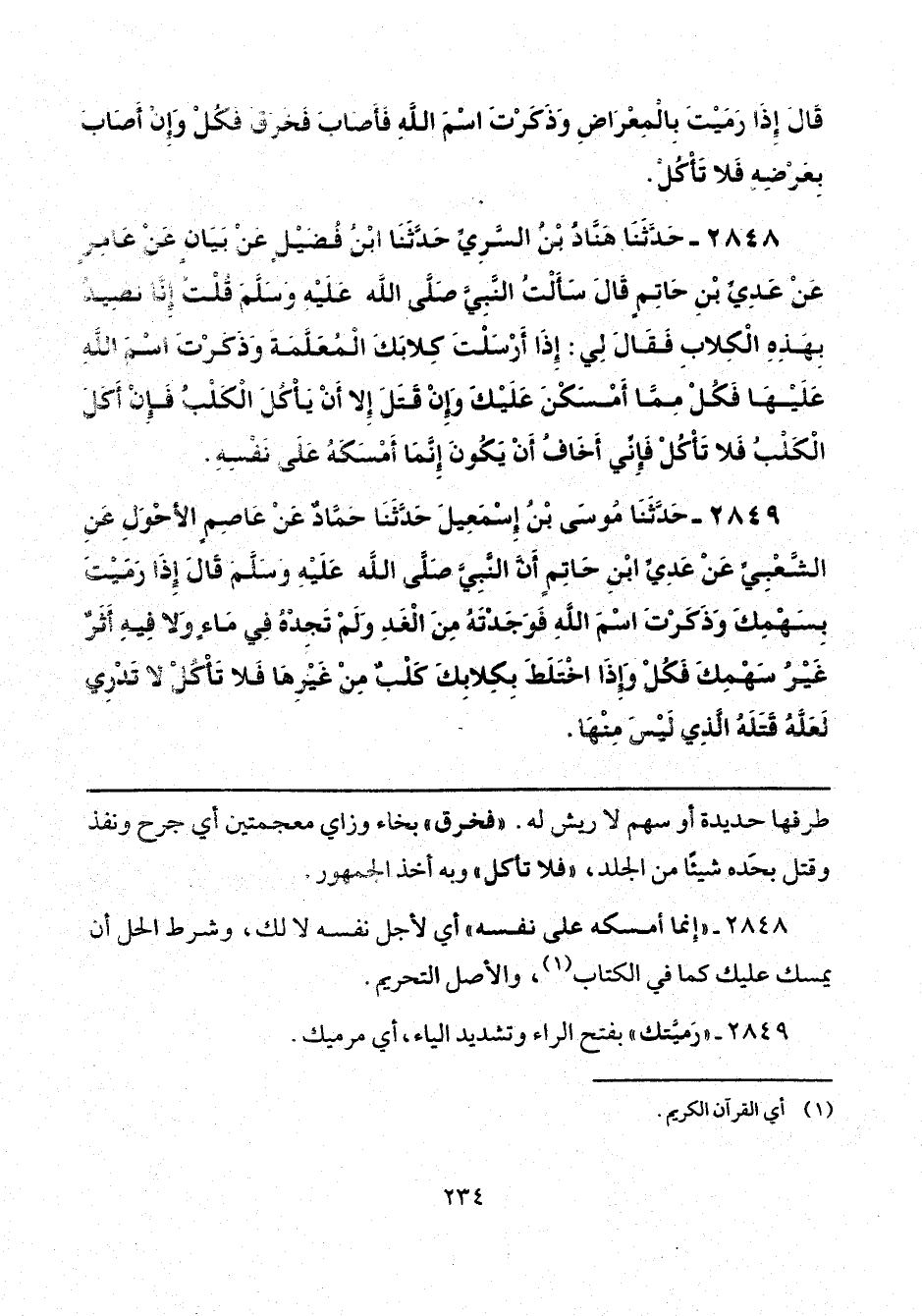 2849 - حَدَّثَنَا مُوسَى بْنُ إِسْمَاعِيلَ، حَدَّثَنَا حَمَّادٌ، عَنْ عَاصِمٍ الْأَحْوَلِ، عَنِ الشَّعْبِيِّ، عَنْ عَدِيِّ بْنِ حَاتِمٍ، أَنَّ النَّبِيَّ صَلَّى اللهُ عَلَيْهِ وَسَلَّمَ قَالَ: «إِذَا رَمَيْتَ بِسَهْمِكَ وَذَكَرْتَ اسْمَ اللَّهِ فَوَجَدْتَهُ مِنَ الْغَدِ، وَلَمْ تَجِدْهُ فِي مَاءٍ وَلَا فِيهِ أَثَرٌ غَيْرُ سَهْمِكَ فَكُلْ، وَإِذَا اخْتَلَطَ بِكِلَابِكَ كَلْبٌ مِنْ غَيْرِهَا فَلَا تَأْكُلْ لَا تَدْرِي لَعَلَّهُ قَتَلَهُ الَّذِي لَيْسَ مِنْهَا».