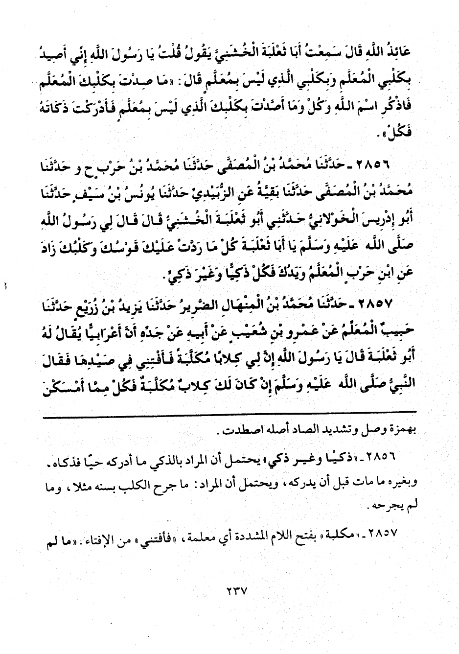 2856 - حَدَّثَنَا مُحَمَّدُ بْنُ الْمُصَفَّى، حَدَّثَنَا مُحَمَّدُ بْنُ حَرْبٍ، ح وحَدَّثَنَا مُحَمَّدُ بْنُ الْمُصَفَّى، حَدَّثَنَا بَقِيَّةُ، عَنِ الزُّبَيْدِيِّ، حَدَّثَنَا يُونُسُ بْنُ سَيْفٍ، حَدَّثَنَا أَبُو إِدْرِيسَ الْخَوْلَانِيُّ، حَدَّثَنِي أَبُو ثَعْلَبَةَ الْخُشَنِيُّ، قَالَ: قَالَ لِي رَسُولُ اللَّهِ صَلَّى اللهُ عَلَيْهِ وَسَلَّمَ: «يَا أَبَا ثَعْلَبَةَ كُلْ مَا رَدَّتْ عَلَيْكَ قَوْسُكَ وَكَلْبُكَ» زَادَ عَنْ ابْنِ حَرْبٍ: «الْمُعَلَّمُ وَيَدُكَ فَكُلْ ذَكِيًّا وَغَيْرَ ذَكِيٍّ».