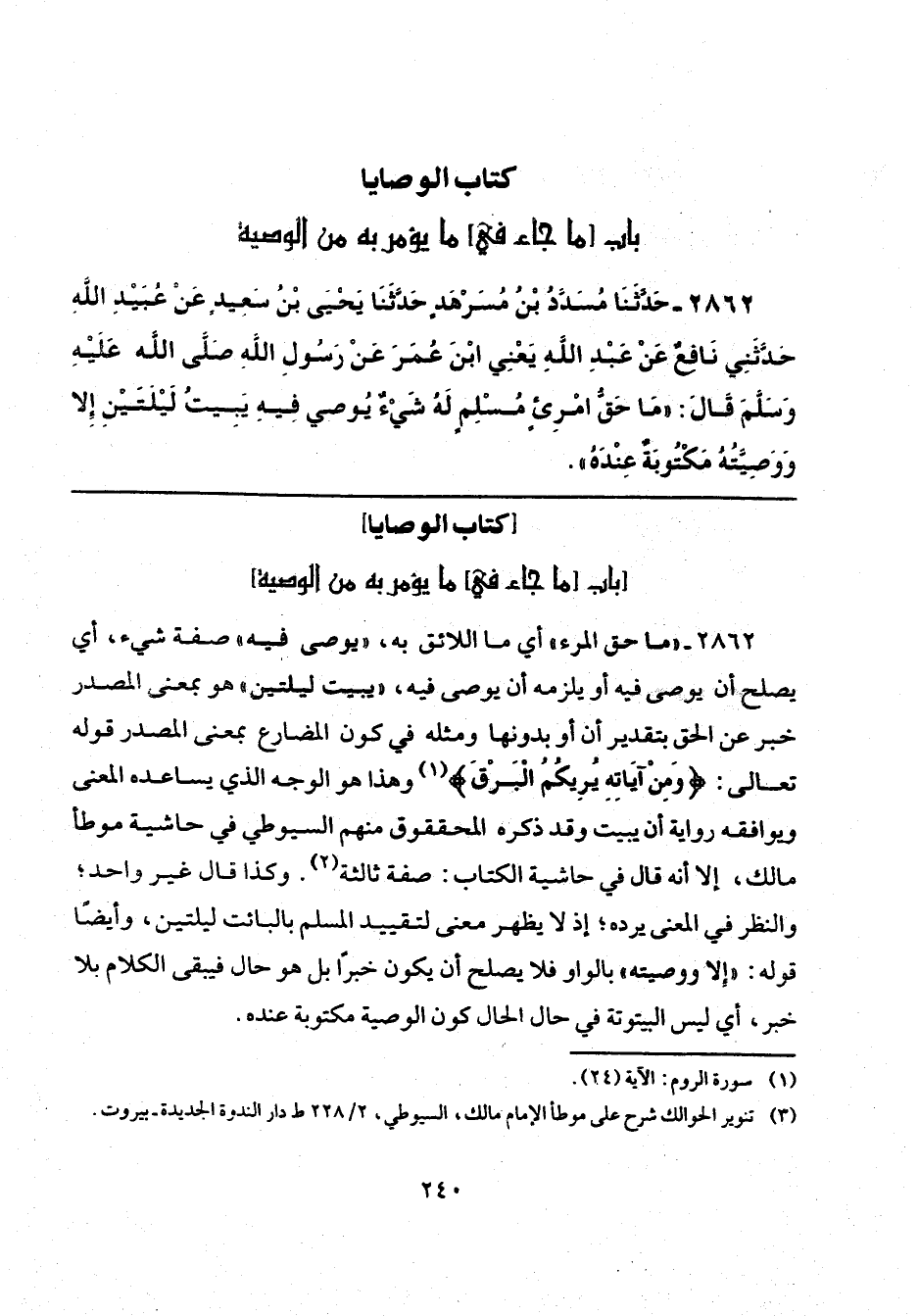 (¬2) تنوير الحوالك شرح على موطأ الإمام مالك، السيوطي، 2/ 228 ط دار الندوة الجديدة- بيروت.