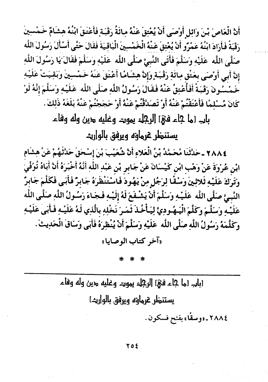 2884 - حَدَّثَنَا مُحَمَّدُ بْنُ الْعَلَاءِ، أَنَّ شُعَيْبَ بْنَ إِسْحَاقَ حَدَّثَهُمْ، عَنْ هِشَامِ بْنِ عُرْوَةَ، عَنْ وَهْبِ بْنِ كَيْسَانَ، عَنْ جَابِرِ بْنِ عَبْدِ اللَّهِ أَنَّهُ أَخْبَرَهُ، أَنَّ أَبَاهُ تُوُفِّيَ وَتَرَكَ عَلَيْهِ ثَلَاثِينَ وَسْقًا لِرَجُلٍ مِنْ يَهُودَ فَاسْتَنْظَرَهُ جَابِرٌ فَأَبَى، فَكَلَّمَ جَابِرٌ النَّبِيَّ صَلَّى اللهُ عَلَيْهِ وَسَلَّمَ أَنْ يَشْفَعَ لَهُ إِلَيْهِ، «فَجَاءَ رَسُولُ اللَّهِ صَلَّى اللهُ عَلَيْهِ وَسَلَّمَ وَكَلَّمَ الْيَهُودِيَّ لِيَأْخُذَ ثَمَرَ نَخْلِهِ بِالَّذِي لَهُ عَلَيْهِ فَأَبَى عَلَيْهِ، وَكَلَّمَهُ رَسُولُ اللَّهِ صَلَّى اللهُ عَلَيْهِ وَسَلَّمَ أَنْ يُنْظِرَهُ فَأَبَى» وَسَاقَ الْحَدِيثَ.