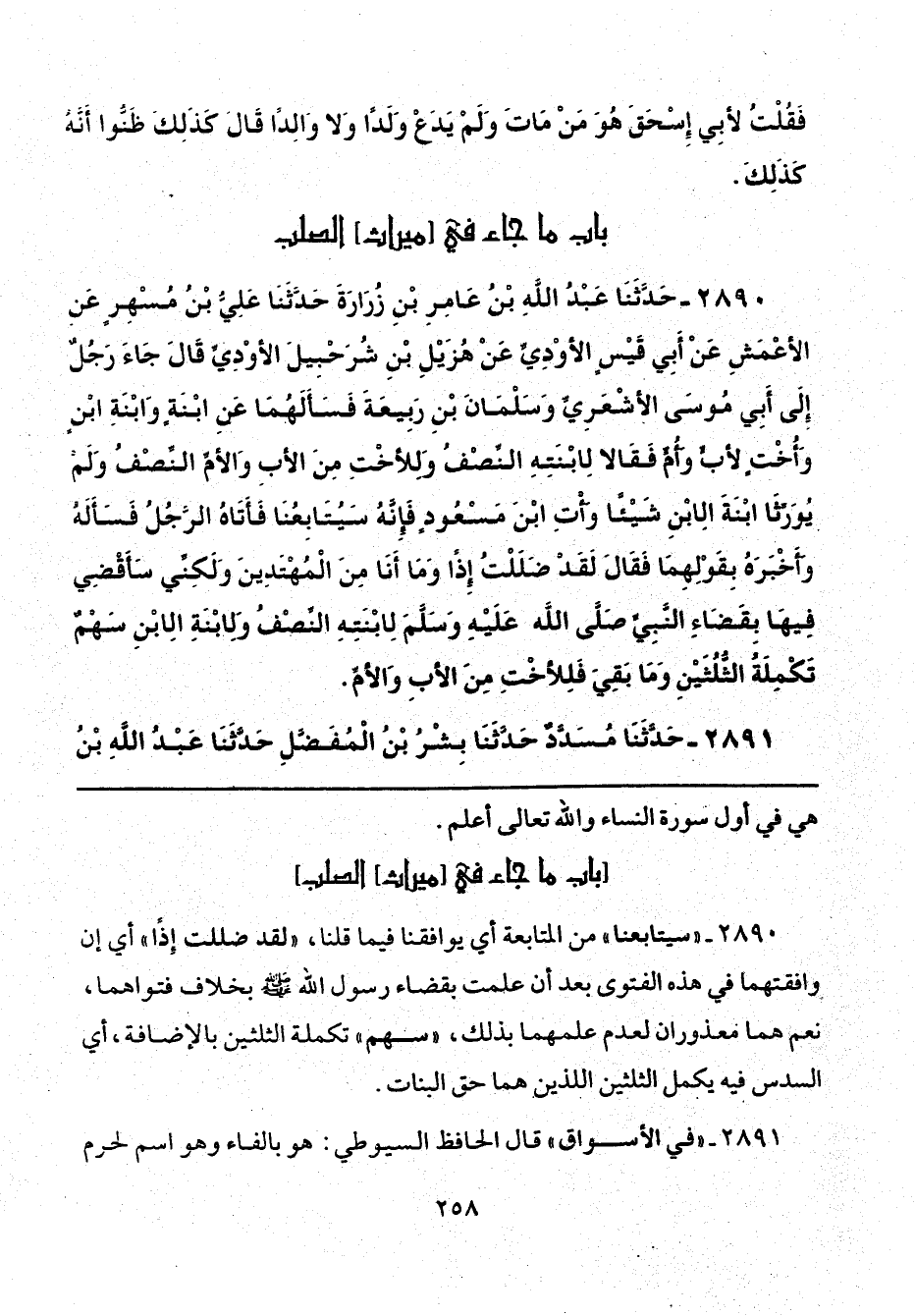 2890 - "سيتابعنا" من المتابعة أي يوافقنا فيما قلنا، "لقد ضللت إِذًا" أي إن وافقتهما في هذه الفتوى بعد أن علمت بقضاء رسول الله - صلى الله عليه وسلم - بخلاف فتواهما، نعم هما فعذوران لعدم علمهما بذلك، "سهم" تكملة الثلثين بالإضافة، أي السدس فيه يكمل الثلثين اللذين هما حق البنات.