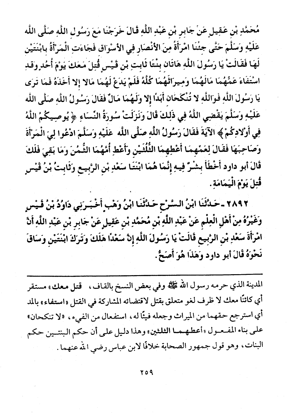 2892 - حَدَّثَنَا ابْنُ السَّرْحِ، حَدَّثَنَا ابْنُ وَهْبٍ، أَخْبَرَنِي دَاوُدُ بْنُ قَيْسٍ، وَغَيْرُهُ مِنْ أَهْلِ الْعِلْمِ، عَنْ عَبْدِ اللَّهِ بْنِ مُحَمَّدِ بْنِ عَقِيلٍ، عَنْ جَابِرِ بْنِ عَبْدِ اللَّهِ، أَنَّ امْرَأَةَ سَعْدِ بْنِ الرَّبِيعِ، قَالَتْ: يَا رَسُولَ اللَّهِ، إِنَّ سَعْدًا هَلَكَ وَتَرَكَ ابْنَتَيْنِ، وَسَاقَ نَحْوَهُ، قَالَ أَبُو دَاوُدَ: «وَهَذَا هُوَ أَصَحُّ»