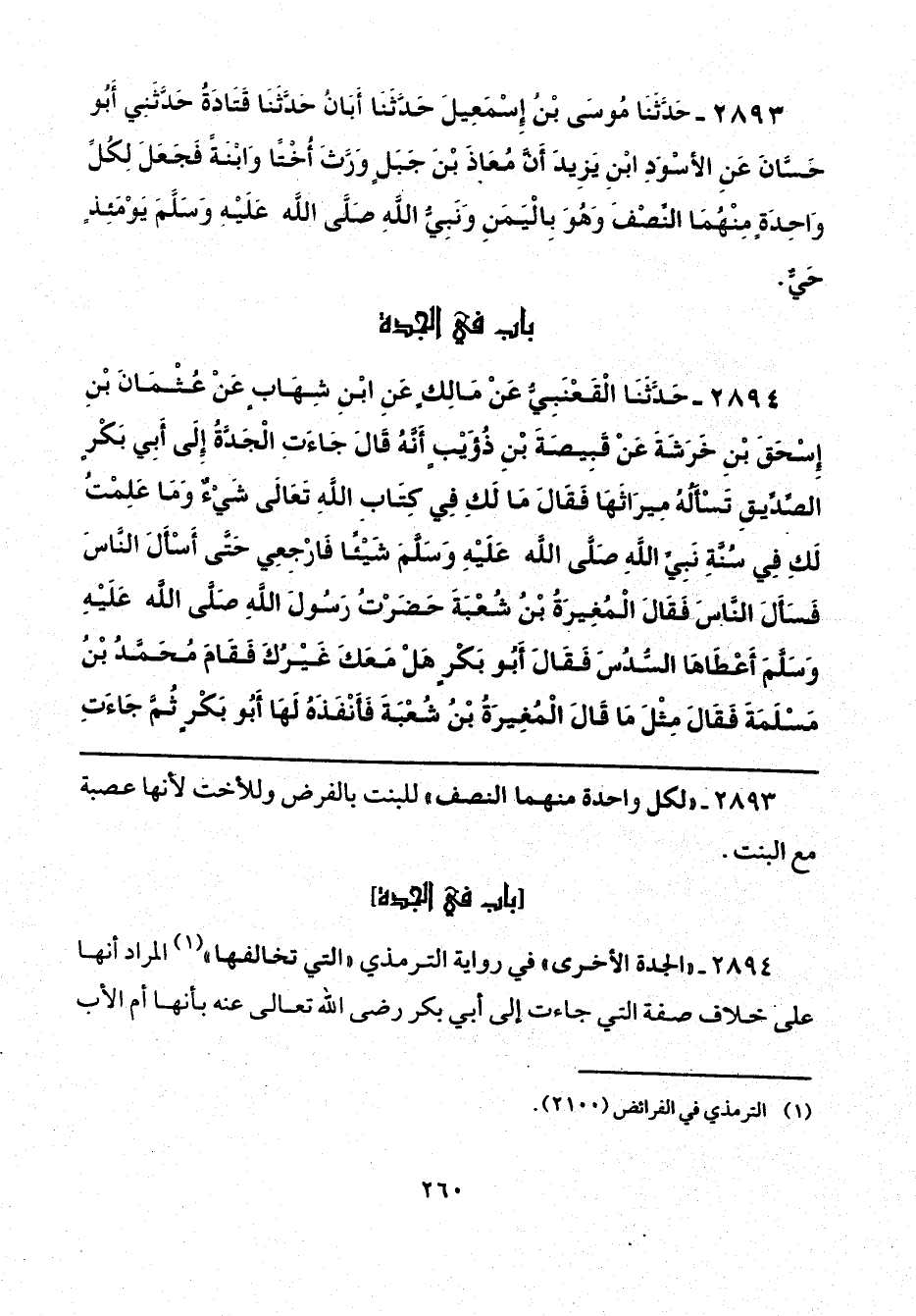 2894 - حَدَّثَنَا الْقَعْنَبِيُّ، عَنْ مَالِكٍ، عَنِ ابْنِ شِهَابٍ، عَنْ عُثْمَانَ بْنِ إِسْحَاقَ بْنِ خَرَشَةَ، عَنْ قَبِيصَةَ بْنِ ذُؤَيْبٍ، أَنَّهُ قَالَ: جَاءَتِ الْجَدَّةُ إِلَى أَبِي بَكْرٍ الصِّدِّيقِ، تَسْأَلُهُ مِيرَاثَهَا؟ فَقَالَ: مَا لَكِ فِي كِتَابِ اللَّهِ تَعَالَى شَيْءٌ، وَمَا عَلِمْتُ لَكِ فِي سُنَّةِ نَبِيِّ اللَّهِ صَلَّى اللهُ عَلَيْهِ وَسَلَّمَ شَيْئًا، فَارْجِعِي حَتَّى أَسْأَلَ النَّاسَ، فَسَأَلَ النَّاسَ، فَقَالَ الْمُغِيرَةُ بْنُ شُعْبَةَ، «حَضَرْتُ رَسُولَ اللَّهِ صَلَّى اللهُ عَلَيْهِ وَسَلَّمَ أَعْطَاهَا السُّدُسَ»، فَقَالَ أَبُو بَكْرٍ: هَلْ مَعَكَ غَيْرُكَ؟ فَقَامَ مُحَمَّدُ بْنُ مَسْلَمَةَ، فَقَالَ: مِثْلَ مَا قَالَ الْمُغِيرَةُ بْنُ شُعْبَةَ فَأَنْفَذَهُ لَهَا أَبُو بَكْرٍ ثُمَّ جَاءَتِ