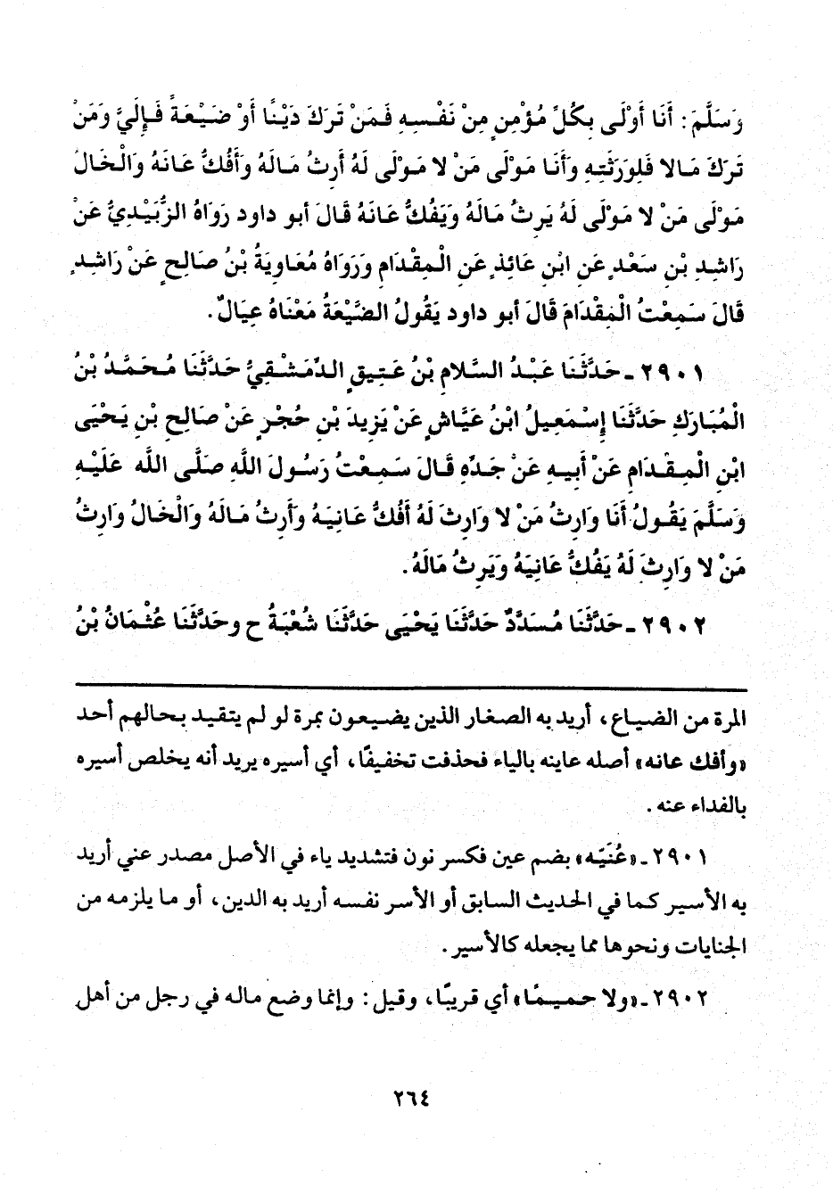 2901 - "عُنَيّه" بضم عين فكسر نون فتشديد ياء في الأصل مصدر عني أريد به الأسير كما في الحديث السابق أو الأسر نفسه أريد به الدين، أو ما يلزمه من الجنايات ونحوها مما يجعله كالأسير.