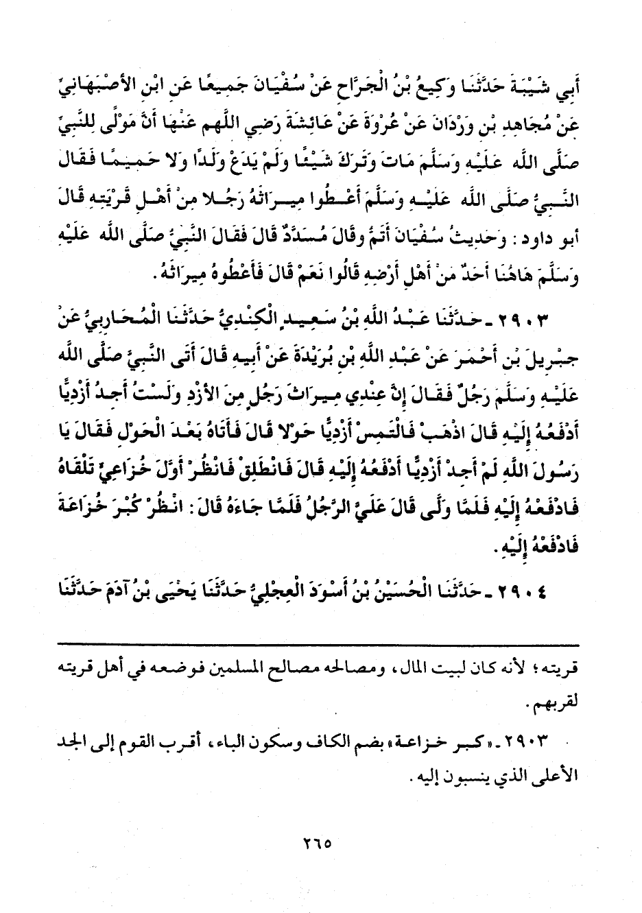 2903 - حَدَّثَنَا عَبْدُ اللَّهِ بْنُ سَعِيدٍ الْكِنْدِيُّ، حَدَّثَنَا الْمُحَارِبِيُّ، عَنْ جِبْرِيلَ بْنِ أَحْمَرَ، عَنْ عَبْدِ اللَّهِ بْنِ بُرَيْدَةَ، عَنْ أَبِيهِ، قَالَ: أَتَى النَّبِيَّ صَلَّى اللهُ عَلَيْهِ وَسَلَّمَ رَجُلٌ، فَقَالَ: إِنَّ عِنْدِي مِيرَاثَ رَجُلٍ مِنَ الْأَزْدِ، وَلَسْتُ أَجِدُ أَزْدِيًّا أَدْفَعُهُ إِلَيْهِ؟ قَالَ: «اذْهَبْ فَالْتَمِسْ أَزْدِيًّا حَوْلًا» قَالَ: فَأَتَاهُ بَعْدَ الْحَوْلِ، فَقَالَ: يَا رَسُولَ اللَّهِ، لَمْ أَجِدْ أَزْدِيًّا أَدْفَعُهُ إِلَيْهِ؟ قَالَ: «فَانْطَلِقْ فَانْظُرْ أَوَّلَ خُزَاعِيٍّ تَلْقَاهُ فَادْفَعْهُ إِلَيْهِ» فَلَمَّا وَلَّى قَالَ: «عَلَيَّ الرَّجُلُ» فَلَمَّا جَاءَهُ، قَالَ: «انْظُرْ كُبْرَ خُزَاعَةَ فَادْفَعْهُ إِلَيْهِ».