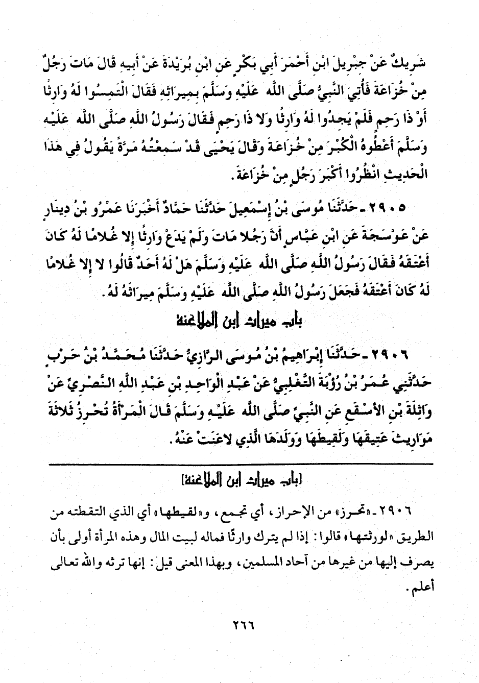 2906 - حَدَّثَنَا إِبْرَاهِيمُ بْنُ مُوسَى الرَّازِيُّ، حَدَّثَنَا مُحَمَّدُ بْنُ حَرْبٍ، حَدَّثَنِي عُمَرُ بْنُ رُؤْبَةَ التَّغْلِبِيُّ، عَنْ عَبْدِ الْوَاحِدِ بْنِ عَبْدِ اللَّهِ النَّصْرِيِّ، عَنْ وَاثِلَةَ بْنِ الْأَسْقَعِ، عَنِ النَّبِيِّ صَلَّى اللهُ عَلَيْهِ وَسَلَّمَ، قَالَ: الْمَرْأَةُ تُحْرِزُ ثَلَاثَةَ مَوَارِيثَ: عَتِيقَهَا، وَلَقِيطَهَا، وَوَلَدَهَا الَّذِي لَاعَنَتْ عَنْهُ.