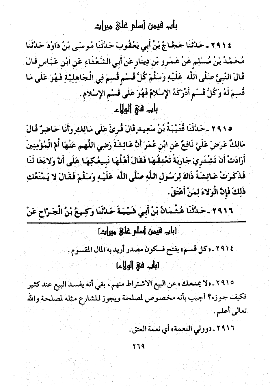 2915 - حَدَّثَنَا قُتَيْبَةُ بْنُ سَعِيدٍ، قَالَ: قُرِئَ عَلَى مَالِكٍ، وَأَنَا حَاضِرٌ، قَالَ مَالِكٌ: عَرَضَ عَلَيَّ نَافِعٌ، عَنِ ابْنِ عُمَرَ، أَنَّ عَائِشَةَ رَضِيَ اللَّهُ عَنْهَا، أُمَّ الْمُؤْمِنِينَ أَرَادَتْ أَنْ تَشْتَرِيَ جَارِيَةً تَعْتِقُهَا، فَقَالَ: أَهْلُهَا نَبِيعُكِهَا عَلَى أَنَّ وَلَاءَهَا لَنَا، فَذَكَرَتْ عَائِشَةُ ذَاكَ لِرَسُولِ اللَّهِ صَلَّى اللهُ عَلَيْهِ وَسَلَّمَ، فَقَالَ: «لَا يَمْنَعُكِ ذَلِكَ فَإِنَّ الْوَلَاءَ لِمَنْ أَعْتَقَ».