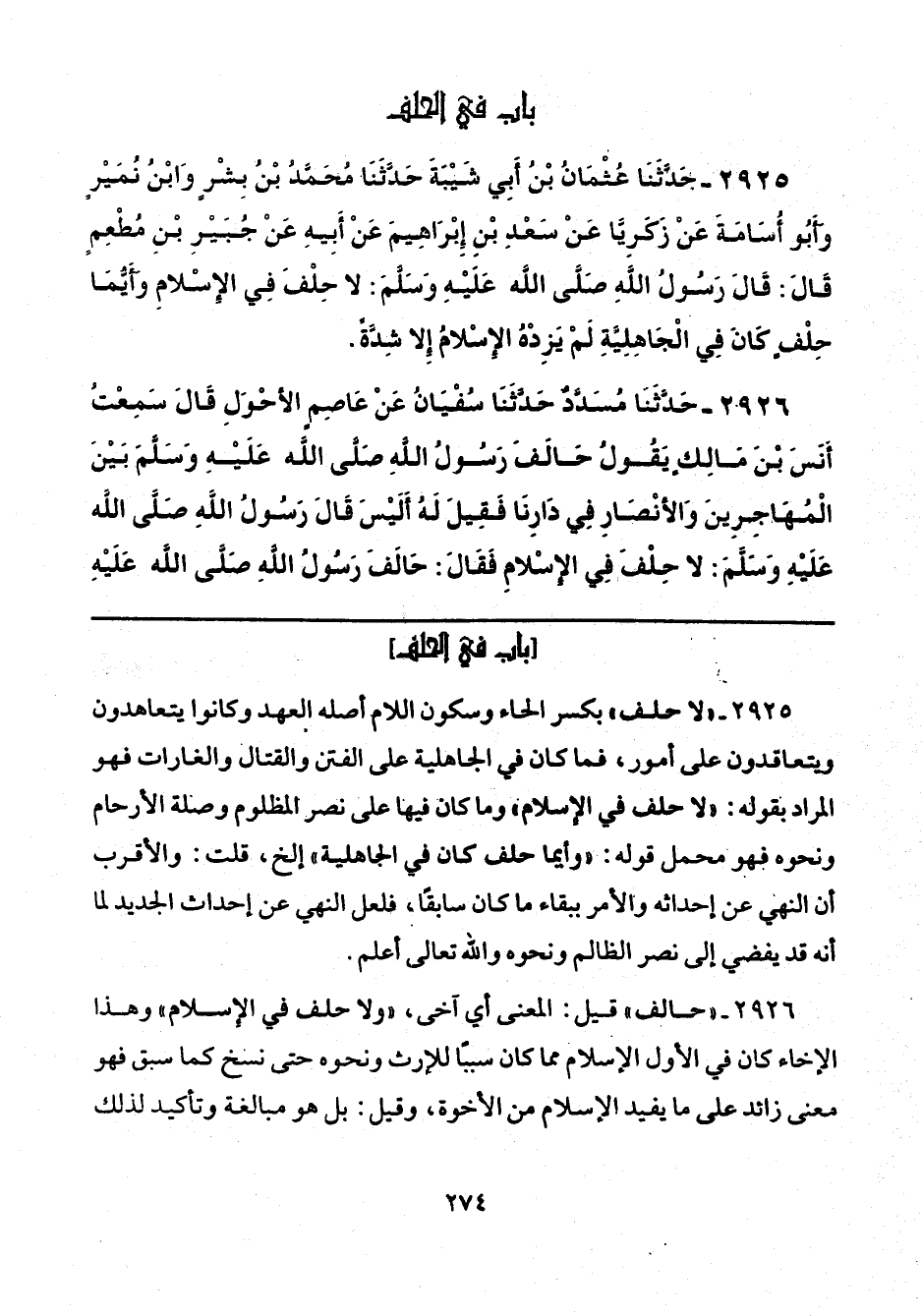 2925 - "لا حلف" بكسر الحاء وسكون اللام أصله العهد وكانوا يتعاهدون ويتعاقدون على أمور، فما كان في الجاهلية على الفتن والقتال والغارات فهو المراد بقوله: "لا حلف في الإسلام" وما كان فيها على نصر المظلوم وصلة الأرحام ونحوه فهو محمل قوله: "وأيما حلف كان في الجاهلية" إلخ، قلت: والأقرب أن النهي عن إحداثه والأمر ببقاء ما كان سابقًا، فلعل النهي عن إحداث الجديد لما أنه قد يفضي إلى نصر الظالم ونحوه والله تعالى أعلم.