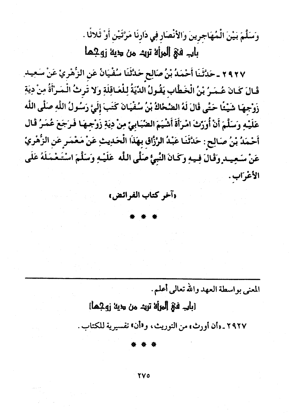 2927 - حَدَّثَنَا أَحْمَدُ بْنُ صَالِحٍ، حَدَّثَنَا سُفْيَانُ، عَنِ الزُّهْرِيِّ، عَنْ سَعِيدٍ، قَالَ: كَانَ عُمَرُ بْنُ الْخَطَّابِ: يَقُولُ: الدِّيَةُ لِلْعَاقِلَةِ، وَلَا تَرِثُ الْمَرْأَةُ مِنْ دِيَةِ زَوْجِهَا شَيْئًا، حَتَّى قَالَ لَهُ الضَّحَّاكُ بْنُ سُفْيَانَ: كَتَبَ إِلَيَّ رَسُولُ اللَّهِ صلّى الله عليه وسلم: «أَنْ أُوَرِّثَ امْرَأَةَ أَشْيَمَ الضِّبَابِيِّ، مِنْ دِيَةِ زَوْجِهَا» فَرَجَعَ عُمَرُ قَالَ أَحْمَدُ بْنُ صَالِحٍ: حَدَّثَنَا عَبْدُ الرَّزَّاقِ، بِهَذَا الْحَدِيثِ، عَنْ مَعْمَرٍ، عَنِ الزُّهْرِيِّ، عَنْ سَعِيدٍ، وَقَالَ فِيهِ: وَكَانَ النَّبِيُّ صَلَّى اللهُ عَلَيْهِ وَسَلَّمَ اسْتَعْمَلَهُ عَلَى الْأَعْرَابِ.