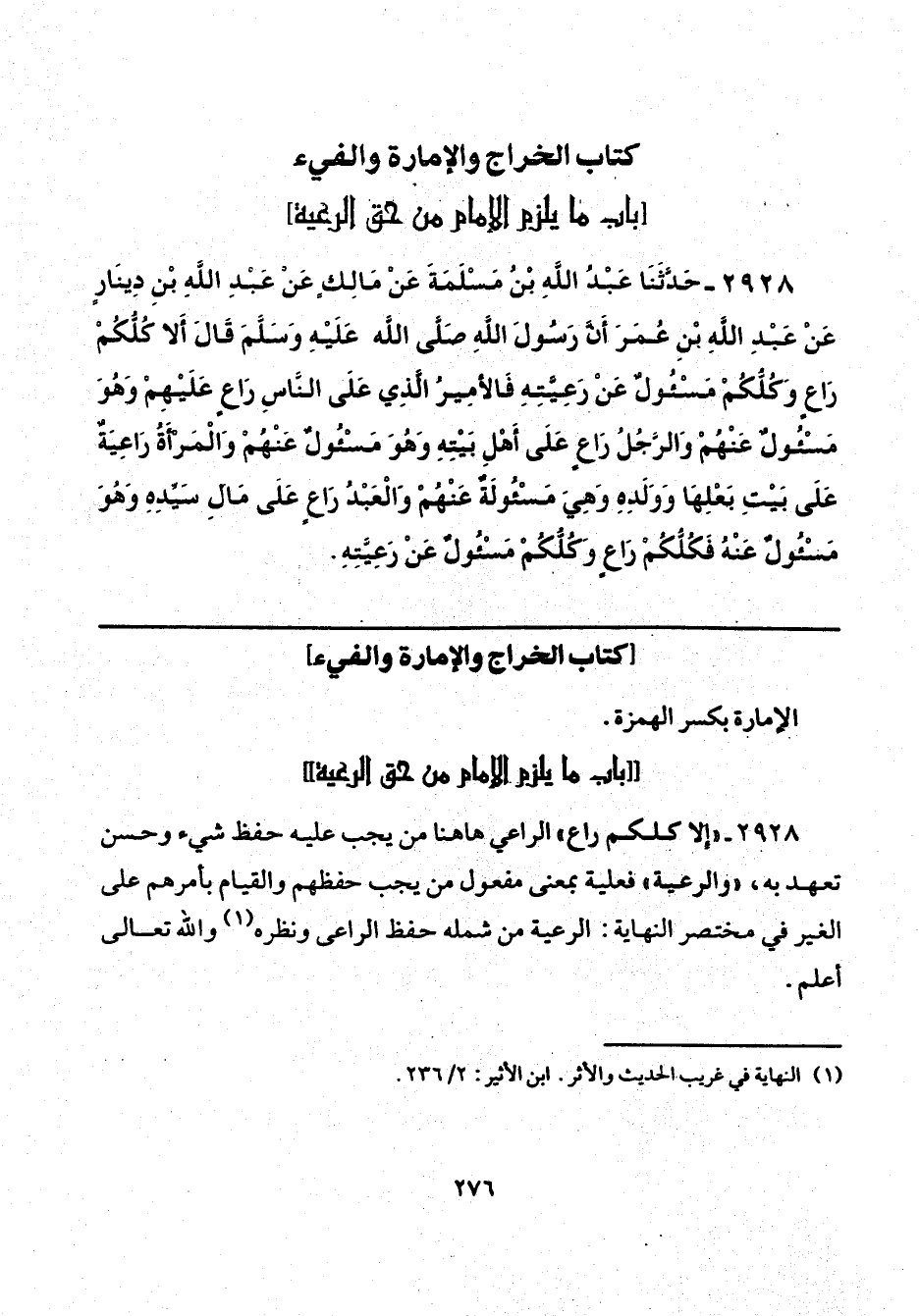 2928 - "إلا كلكم راع" الراعي ها هنا من يجب عليه حفظ شيء وحسن تعهد به، "والرعية" فعلية بمعنى مفعول من يجب حفظهم والقيام بأمرهم على الغير في مختصر النهاية: الرعية من شمله حفظ الراعى ونظره (¬1) والله تعالى أعلم.