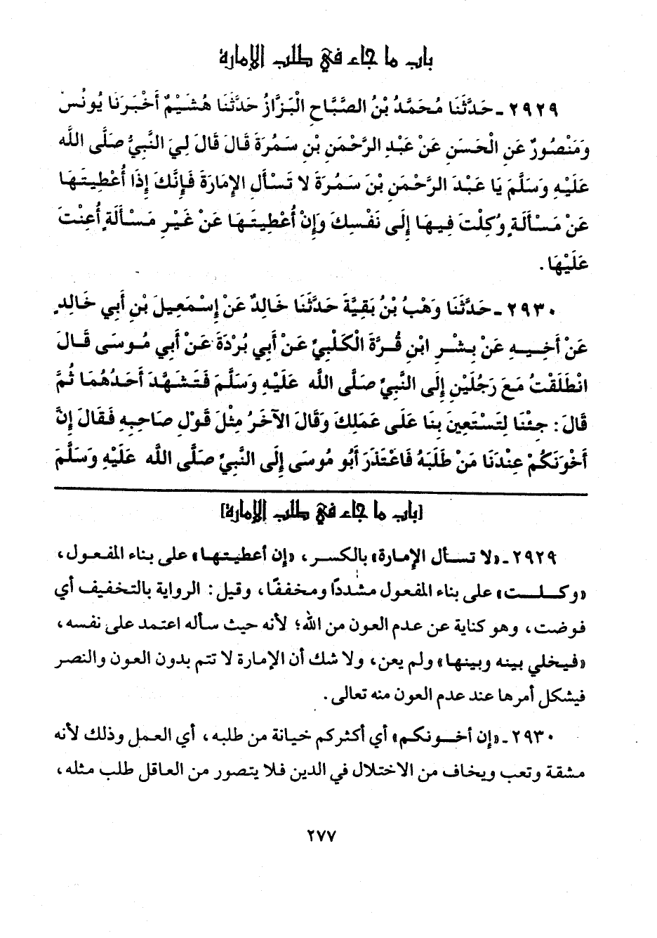 2929 - "لا تسأل الإمارة" بالكسر، "إن أعطيتها" على بناء المفعول، "وكلت" على بناء المفعول مشددًا ومخففًا، وقيل: الرواية بالتخفيف أي فوضت، وهو كناية عن عدم العون من الله؛ لأنه حيث سأله اعتمد على نفسه، "فيخلي بيننه وبينها" ولم يعن، ولا شك أن الإمارة لا تتم بدون العون والنصر فيشكل أمرها عند عدم العون منه تعالى.