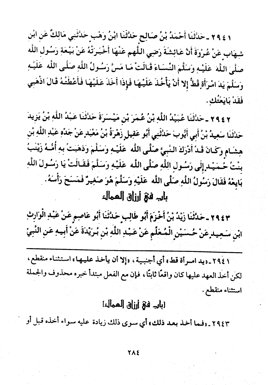 2941 - "يد امرأة قط" أي أجنبية، "إلا أن يأخذ عليها" استثناء منقطع، لكن أخذ العهد عليها كان واقعًا ثابتًا، فإن مع الفعل مبتدأ خبره محذوف والجملة استثناء منقطع.
