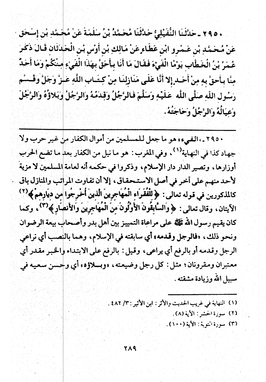 2950 - حَدَّثَنَا النُّفَيْلِيُّ، حَدَّثَنَا مُحَمَّدُ بْنُ سَلَمَةَ، عَنْ مُحَمَّدِ بْنِ إِسْحَاقَ، عَنْ مُحَمَّدِ بْنِ عَمْرِو بْنِ عَطَاءٍ، عَنْ مَالِكِ بْنِ أَوْسِ بْنِ الْحَدَثَانِ، قَالَ: ذَكَرَ عُمَرُ بْنُ الْخَطَّابِ، يَوْمًا الْفَيْءَ، فَقَالَ: «مَا أَنَا بِأَحَقَّ، بِهَذَا الْفَيْءِ مِنْكُمْ، وَمَا أَحَدٌ مِنَّا بِأَحَقَّ بِهِ مِنْ أَحَدٍ، إِلَّا أَنَّا عَلَى مَنَازِلِنَا مِنْ كِتَابِ اللَّهِ عَزَّ وَجَلَّ، وَقَسْمِ رَسُولِ اللَّهِ صَلَّى اللهُ عَلَيْهِ وَسَلَّمَ، فَالرَّجُلُ وَقِدَمُهُ، وَالرَّجُلُ وَبَلَاؤُهُ، وَالرَّجُلُ وَعِيَالُهُ، وَالرَّجُلُ وَحَاجَتُهُ».