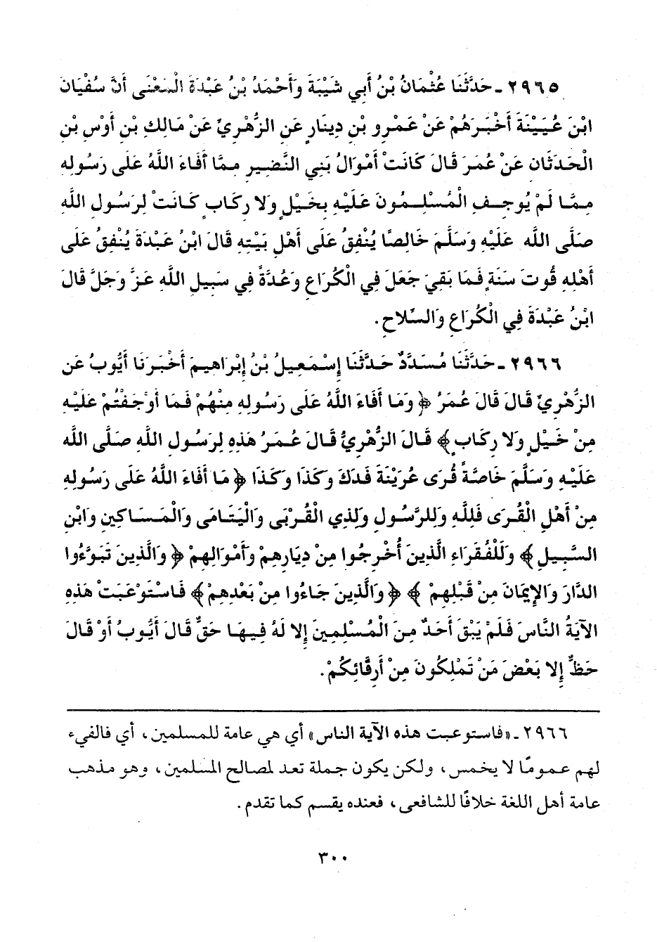 2965 - حَدَّثَنَا عُثْمَانُ بْنُ أَبِي شَيْبَةَ، وَأَحْمَدُ بْنُ عَبْدَةَ الْمَعْنَى، أَنَّ سُفْيَانَ بْنَ عُيَيْنَةَ، أَخْبَرَهُمْ عَنْ عَمْرِو بْنِ دِينَارٍ، عَنِ الزُّهْرِيِّ، عَنْ مَالِكِ بْنِ أَوْسِ بْنِ الْحَدَثَانِ، عَنْ عُمَرَ، قَالَ: كَانَتْ أَمْوَالُ بَنِي النَّضِيرِ مِمَّا أَفَاءَ اللَّهُ عَلَى رَسُولِهِ، مِمَّا لَمْ يُوجِفِ الْمُسْلِمُونَ عَلَيْهِ بِخَيْلٍ، وَلَا رِكَابٍ، كَانَتْ لِرَسُولِ اللَّهِ صَلَّى اللهُ عَلَيْهِ وَسَلَّمَ خَالِصًا، يُنْفِقُ عَلَى أَهْلِ بَيْتِهِ - قَالَ ابْنُ عَبْدَةَ: يُنْفِقُ عَلَى أَهْلِهِ - قُوتَ سَنَةٍ، فَمَا بَقِيَ جَعَلَ فِي الْكُرَاعِ، وَعُدَّةً فِي سَبِيلِ اللَّهِ عَزَّ وَجَلَّ قَالَ ابْنُ عَبْدَةَ: فِي الْكُرَاعِ وَالسِّلَاحِ.